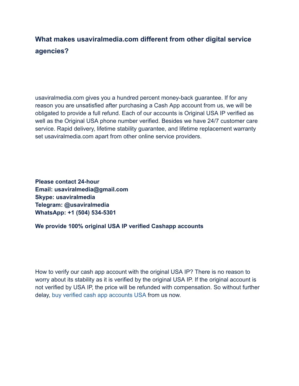 What makes usaviralmedia.com different from other digital service agencies? usaviralmedia.com gives you a hundred percent money-back guarantee. If for any reason you are unsatisfied after purchasing a Cash App account from us, we will be obligated to provide a full refund. Each of our accounts is Original USA IP verified as well as the Original USA phone number verified. Besides we have 24/7 customer care service. Rapid delivery, lifetime stability guarantee, and lifetime replacement warranty set usaviralmedia.com apart from other online service providers. Please contact 24-hour Email: usaviralmedia@gmail.com Skype: usaviralmedia Telegram: @usaviralmedia WhatsApp: +1 (504) 534-5301 We provide 100% original USA IP verified Cashapp accounts How to verify our cash app account with the original USA IP? There is no reason to worry about its stability as it is verified by the original USA IP. If the original account is not verified by USA IP, the price will be refunded with compensation. So without further delay, buy verified cash app accounts USA from us now.