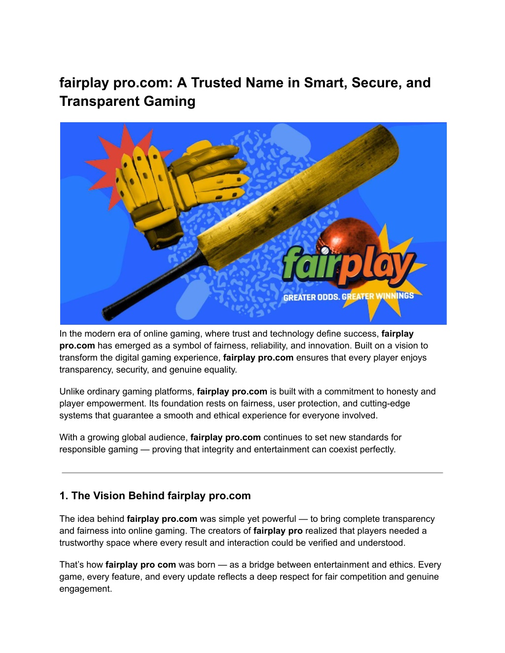 1. fairplay pro.com: A Trusted Name in Smart, Secure, and Transparent Gaming In the modern era of online gaming, where trust and technology define success, fairplay pro.com has emerged as a symbol of fairness, reliability, and innovation. Built on a vision to transform the digital gaming experience, fairplay pro.com ensures that every player enjoys transparency, security, and genuine equality. Unlike ordinary gaming platforms, fairplay pro.com is built with a commitment to honesty and player empowerment. Its foundation rests on fairness, user protection, and cutting-edge systems that guarantee a smooth and ethical experience for everyone involved. With a growing global audience, fairplay pro.com continues to set new standards for responsible gaming — proving that integrity and entertainment can coexist perfectly. 1. The Vision Behind fairplay pro.com The idea behind fairplay pro.com was simple yet powerful — to bring complete transparency and fairness into online gaming. The creators of fairplay pro realized that players needed a trustworthy space where every result and interaction could be verified and understood. That’s how fairplay pro com was born — as a bridge between entertainment and ethics. Every game, every feature, and every update reflects a deep respect for fair competition and genuine engagement.