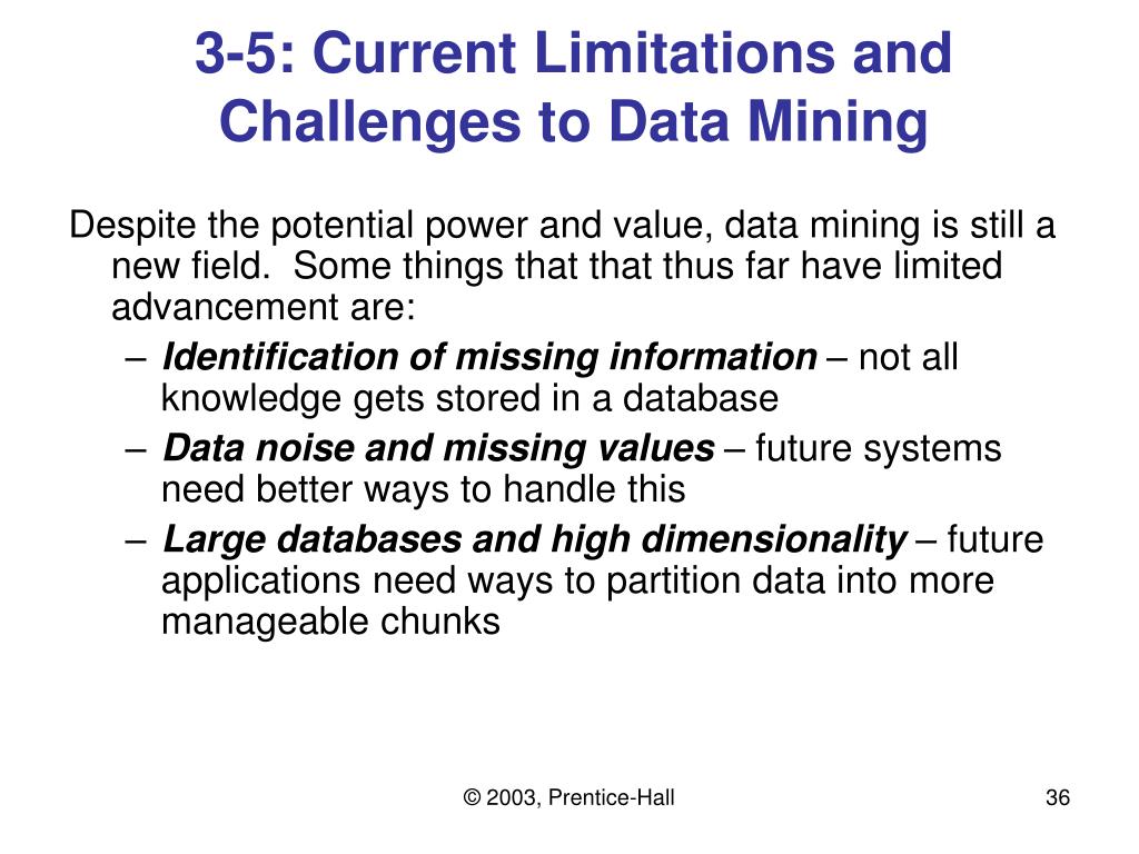 3-5: Current Limitations and Challenges to Data Mining Despite the potential power and value, data mining is still a new field. Some things that that thus far have limited advancement are: • Identification of missing information – not all knowledge gets stored in a database • Data noise and missing values – future systems need better ways to handle this • Large databases and high dimensionality – future applications need ways to partition data into more manageable chunks © 2003, Prentice-Hall
