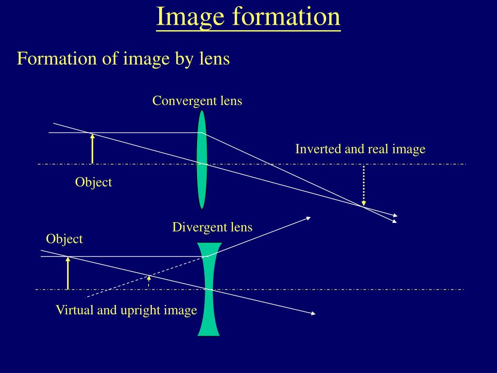 Convergent lens Inverted and real image Object Divergent lens Object Virtual and upright image Image formation Formation of image by lens