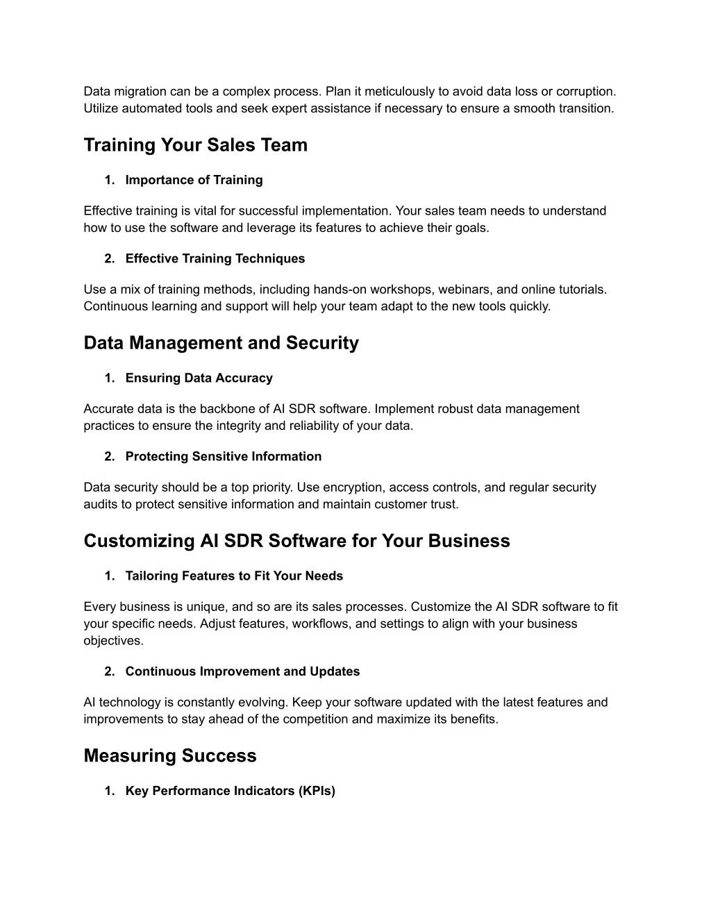 Data migration can be a complex process. Plan it meticulously to avoid data loss or corruption. Utilize automated tools and seek expert assistance if necessary to ensure a smooth transition. Training Your Sales Team 1. Importance of Training Effective training is vital for successful implementation. Your sales team needs to understand how to use the software and leverage its features to achieve their goals. 2. Effective Training Techniques Use a mix of training methods, including hands-on workshops, webinars, and online tutorials. Continuous learning and support will help your team adapt to the new tools quickly. Data Management and Security 1. Ensuring Data Accuracy Accurate data is the backbone of AI SDR software. Implement robust data management practices to ensure the integrity and reliability of your data. 2. Protecting Sensitive Information Data security should be a top priority. Use encryption, access controls, and regular security audits to protect sensitive information and maintain customer trust. Customizing AI SDR Software for Your Business 1. Tailoring Features to Fit Your Needs Every business is unique, and so are its sales processes. Customize the AI SDR software to fit your specific needs. Adjust features, workflows, and settings to align with your business objectives. 2. Continuous Improvement and Updates AI technology is constantly evolving. Keep your software updated with the latest features and improvements to stay ahead of the competition and maximize its benefits. Measuring Success 1. Key Performance Indicators (KPIs)