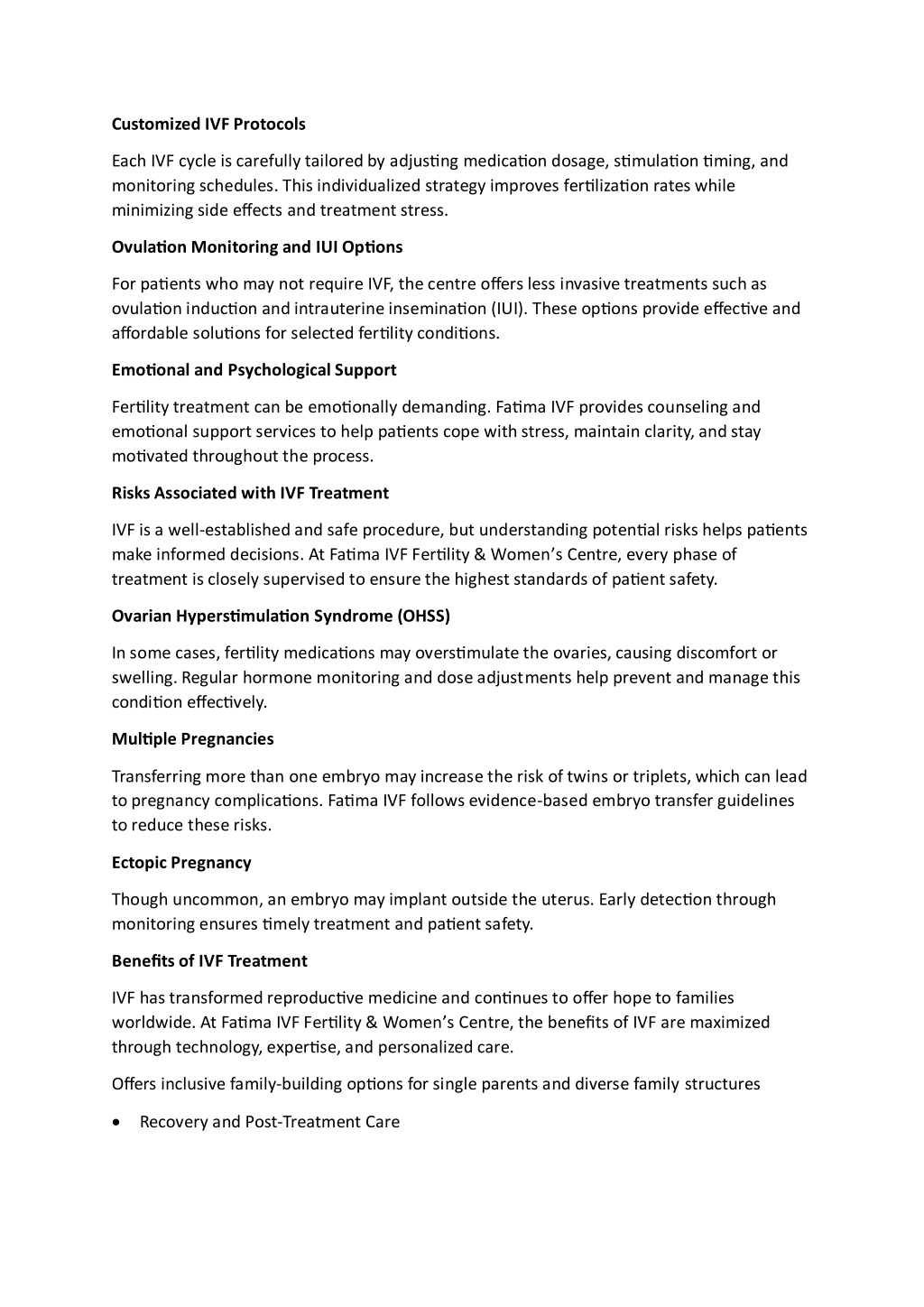 Customized IVF Protocols Each IVF cycle is carefully tailored by adjusting medication dosage, stimulation timing, and monitoring schedules. This individualized strategy improves fertilization rates while minimizing side effects and treatment stress. Ovulation Monitoring and IUI Options For patients who may not require IVF, the centre offers less invasive treatments such as ovulation induction and intrauterine insemination (IUI). These options provide effective and affordable solutions for selected fertility conditions. Emotional and Psychological Support Fertility treatment can be emotionally demanding. Fatima IVF provides counseling and emotional support services to help patients cope with stress, maintain clarity, and stay motivated throughout the process. Risks Associated with IVF Treatment IVF is a well-established and safe procedure, but understanding potential risks helps patients make informed decisions. At Fatima IVF Fertility & Women’s Centre, every phase of treatment is closely supervised to ensure the highest standards of patient safety. Ovarian Hyperstimulation Syndrome (OHSS) In some cases, fertility medications may overstimulate the ovaries, causing discomfort or swelling. Regular hormone monitoring and dose adjustments help prevent and manage this condition effectively. Multiple Pregnancies Transferring more than one embryo may increase the risk of twins or triplets, which can lead to pregnancy complications. Fatima IVF follows evidence-based embryo transfer guidelines to reduce these risks. Ectopic Pregnancy Though uncommon, an embryo may implant outside the uterus. Early detection through monitoring ensures timely treatment and patient safety. Benefits of IVF Treatment IVF has transformed reproductive medicine and continues to offer hope to families worldwide. At Fatima IVF Fertility & Women’s Centre, the benefits of IVF are maximized through technology, expertise, and personalized care. Offers inclusive family-building options for single parents and diverse family structures Recovery and Post-Treatment Care