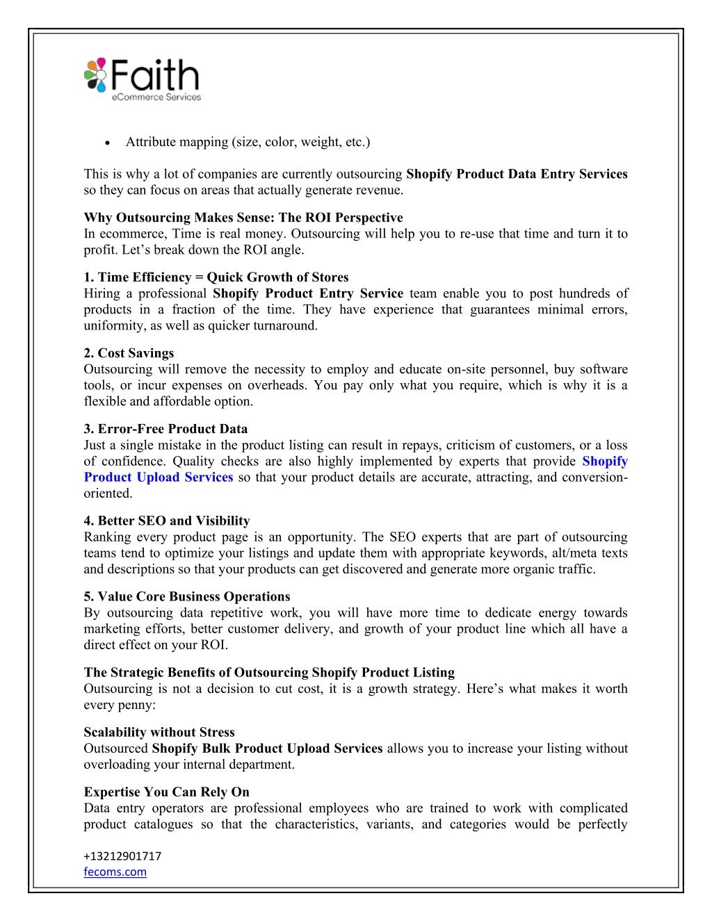 •Attribute mapping (size, color, weight, etc.) This is why a lot of companies are currently outsourcing Shopify Product Data Entry Services so they can focus on areas that actually generate revenue. Why Outsourcing Makes Sense: The ROI Perspective In ecommerce, Time is real money. Outsourcing will help you to re-use that time and turn it to profit. Let’s break down the ROI angle. 1. Time Efficiency = Quick Growth of Stores Hiring a professional Shopify Product Entry Service team enable you to post hundreds of products in a fraction of the time. They have experience that guarantees minimal errors, uniformity, as well as quicker turnaround. 2. Cost Savings Outsourcing will remove the necessity to employ and educate on-site personnel, buy software tools, or incur expenses on overheads. You pay only what you require, which is why it is a flexible and affordable option. 3. Error-Free Product Data Just a single mistake in the product listing can result in repays, criticism of customers, or a loss of confidence. Quality checks are also highly implemented by experts that provide Shopify Product Upload Services so that your product details are accurate, attracting, and conversion- oriented. 4. Better SEO and Visibility Ranking every product page is an opportunity. The SEO experts that are part of outsourcing teams tend to optimize your listings and update them with appropriate keywords, alt/meta texts and descriptions so that your products can get discovered and generate more organic traffic. 5. Value Core Business Operations By outsourcing data repetitive work, you will have more time to dedicate energy towards marketing efforts, better customer delivery, and growth of your product line which all have a direct effect on your ROI. The Strategic Benefits of Outsourcing Shopify Product Listing Outsourcing is not a decision to cut cost, it is a growth strategy. Here’s what makes it worth every penny: Scalability without Stress Outsourced Shopify Bulk Product Upload Services allows you to increase your listing without overloading your internal department. Expertise You Can Rely On Data entry operators are professional employees who are trained to work with complicated product catalogues so that the characteristics, variants, and categories would be perfectly +13212901717 fecoms.com