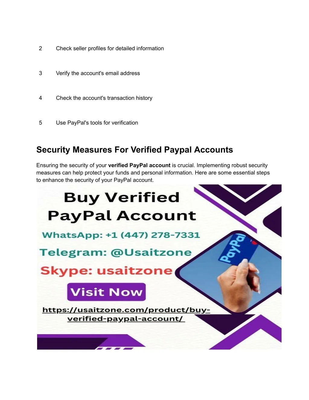 Buying a verified PayPal account can be risky. Ensure you purchase from a reputable source. Verify the seller's credentials and reviews before making a purchase. How Do I Verify My Paypal Account? To verify your PayPal account, link a bank account or credit card. Follow PayPal’s verification process. This enhances security and trustworthiness. Conclusion Purchasing a verified PayPal account offers security and convenience. It ensures safe transactions for personal or business use. 24 hours response/ (Contact US) WhatsApp: +1 (447) 278-7331 Telegram: @Usaitzone Skype: usaitzone Email: usaitzone@gmail.com https://usaitzone.com/product/buy-verified-paypal-account/ Make sure to choose a reputable seller. This way, you can enjoy the benefits without any risks. Don't compromise on your financial safety; buy wisely and stay protected.