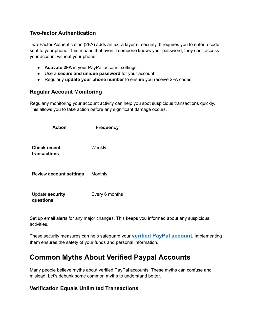 Two-factor Authentication Two-Factor Authentication (2FA) adds an extra layer of security. It requires you to enter a code sent to your phone. This means that even if someone knows your password, they can't access your account without your phone. ● ● ● Activate 2FA in your PayPal account settings. Use a secure and unique password for your account. Regularly update your phone number to ensure you receive 2FA codes. Regular Account Monitoring Regularly monitoring your account activity can help you spot suspicious transactions quickly. This allows you to take action before any significant damage occurs. Action Frequency Check recent transactions Weekly Review account settings Monthly Update security questions Every 6 months Set up email alerts for any major changes. This keeps you informed about any suspicious activities. These security measures can help safeguard your verified PayPal account. Implementing them ensures the safety of your funds and personal information. Common Myths About Verified Paypal Accounts Many people believe myths about verified PayPal accounts. These myths can confuse and mislead. Let's debunk some common myths to understand better. Verification Equals Unlimited Transactions