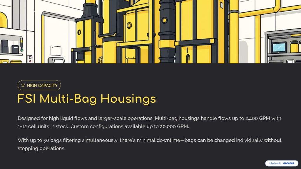 HIGH CAPACITY FSI Multi-Bag Housings Designed for high liquid flows and larger-scale operations. Multi-bag housings handle flows up to 2,400 GPM with 1-12 cell units in stock. Custom configurations available up to 20,000 GPM. With up to 50 bags filtering simultaneously, there's minimal downtime—bags can be changed individually without stopping operations.