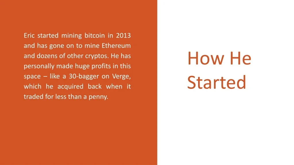 Eric started mining bitcoin in 2013 and has gone on to mine Ethereum and dozens of other cryptos. He has personally made huge profits in this space – like a 30-bagger on Verge, which he acquired back when it traded for less than a penny. • How He Started