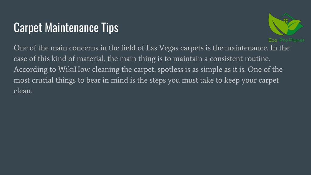 Carpet Maintenance Tips One of the main concerns in the field of Las Vegas carpets is the maintenance. In the case of this kind of material, the main thing is to maintain a consistent routine. According to WikiHow cleaning the carpet, spotless is as simple as it is. One of the most crucial things to bear in mind is the steps you must take to keep your carpet clean.