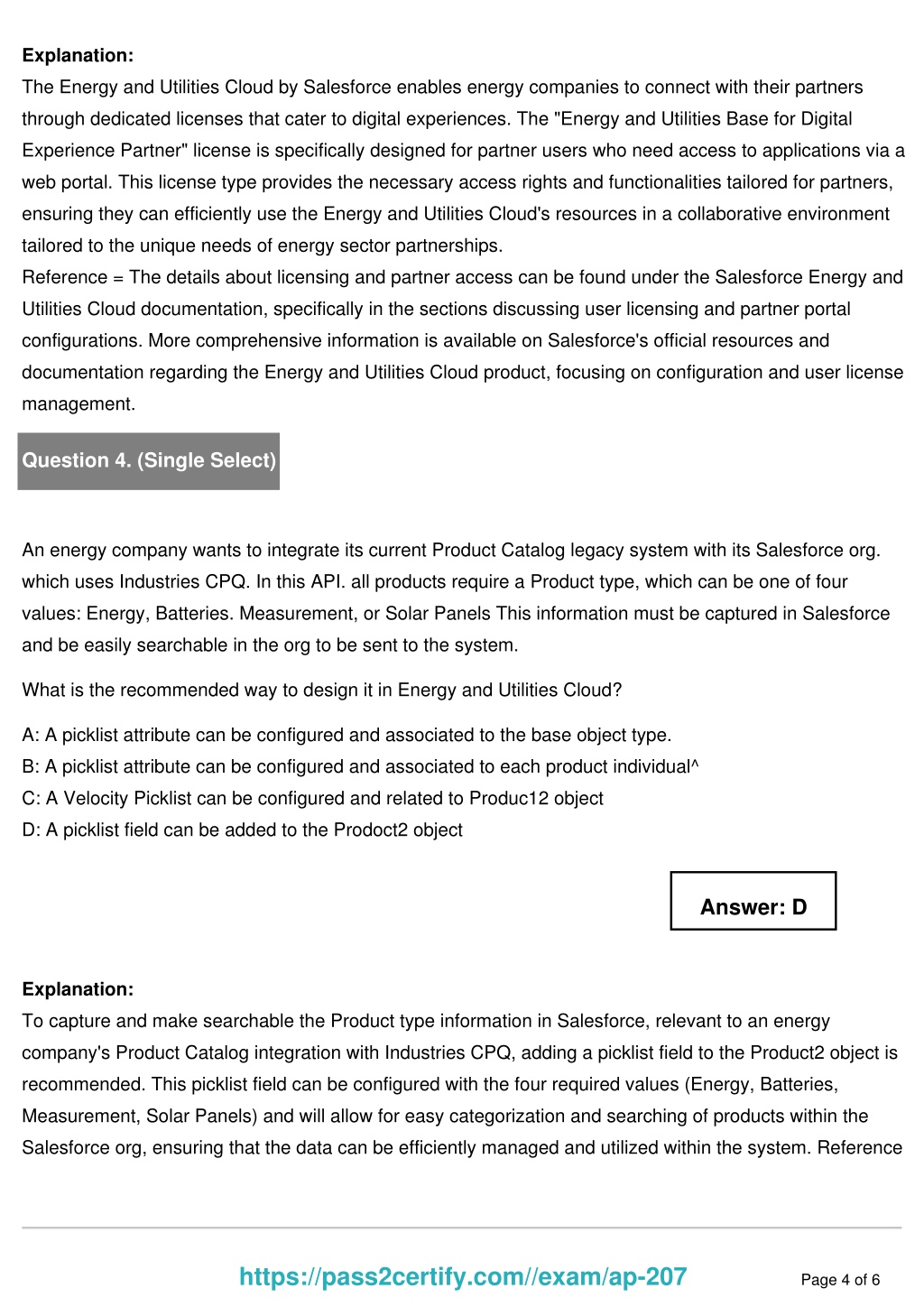 Explanation: The Energy and Utilities Cloud by Salesforce enables energy companies to connect with their partners through dedicated licenses that cater to digital experiences. The "Energy and Utilities Base for Digital Experience Partner" license is specifically designed for partner users who need access to applications via a web portal. This license type provides the necessary access rights and functionalities tailored for partners, ensuring they can efficiently use the Energy and Utilities Cloud's resources in a collaborative environment tailored to the unique needs of energy sector partnerships. Reference = The details about licensing and partner access can be found under the Salesforce Energy and Utilities Cloud documentation, specifically in the sections discussing user licensing and partner portal configurations. More comprehensive information is available on Salesforce's official resources and documentation regarding the Energy and Utilities Cloud product, focusing on configuration and user license management. Question 4. (Single Select) An energy company wants to integrate its current Product Catalog legacy system with its Salesforce org. which uses Industries CPQ. In this API. all products require a Product type, which can be one of four values: Energy, Batteries. Measurement, or Solar Panels This information must be captured in Salesforce and be easily searchable in the org to be sent to the system. What is the recommended way to design it in Energy and Utilities Cloud? A: A picklist attribute can be configured and associated to the base object type. B: A picklist attribute can be configured and associated to each product individual^ C: A Velocity Picklist can be configured and related to Produc12 object D: A picklist field can be added to the Prodoct2 object Answer: D Explanation: To capture and make searchable the Product type information in Salesforce, relevant to an energy company's Product Catalog integration with Industries CPQ, adding a picklist field to the Product2 object is recommended. This picklist field can be configured with the four required values (Energy, Batteries, Measurement, Solar Panels) and will allow for easy categorization and searching of products within the Salesforce org, ensuring that the data can be efficiently managed and utilized within the system. Reference https://pass2certify.com//exam/ap-207 Page 4 of 6