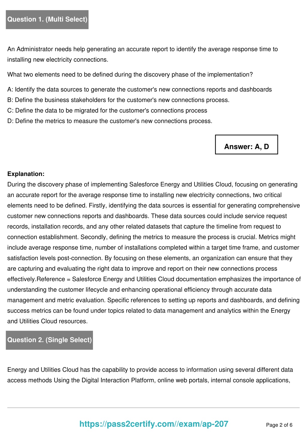 Question 1. (Multi Select) An Administrator needs help generating an accurate report to identify the average response time to installing new electricity connections. What two elements need to be defined during the discovery phase of the implementation? A: Identify the data sources to generate the customer's new connections reports and dashboards B: Define the business stakeholders for the customer's new connections process. C: Define the data to be migrated for the customer's connections process D: Define the metrics to measure the customer's new connections process. Answer: A, D Explanation: During the discovery phase of implementing Salesforce Energy and Utilities Cloud, focusing on generating an accurate report for the average response time to installing new electricity connections, two critical elements need to be defined. Firstly, identifying the data sources is essential for generating comprehensive customer new connections reports and dashboards. These data sources could include service request records, installation records, and any other related datasets that capture the timeline from request to connection establishment. Secondly, defining the metrics to measure the process is crucial. Metrics might include average response time, number of installations completed within a target time frame, and customer satisfaction levels post-connection. By focusing on these elements, an organization can ensure that they are capturing and evaluating the right data to improve and report on their new connections process effectively.Reference = Salesforce Energy and Utilities Cloud documentation emphasizes the importance of understanding the customer lifecycle and enhancing operational efficiency through accurate data management and metric evaluation. Specific references to setting up reports and dashboards, and defining success metrics can be found under topics related to data management and analytics within the Energy and Utilities Cloud resources. Question 2. (Single Select) Energy and Utilities Cloud has the capability to provide access to information using several different data access methods Using the Digital Interaction Platform, online web portals, internal console applications, https://pass2certify.com//exam/ap-207 Page 2 of 6