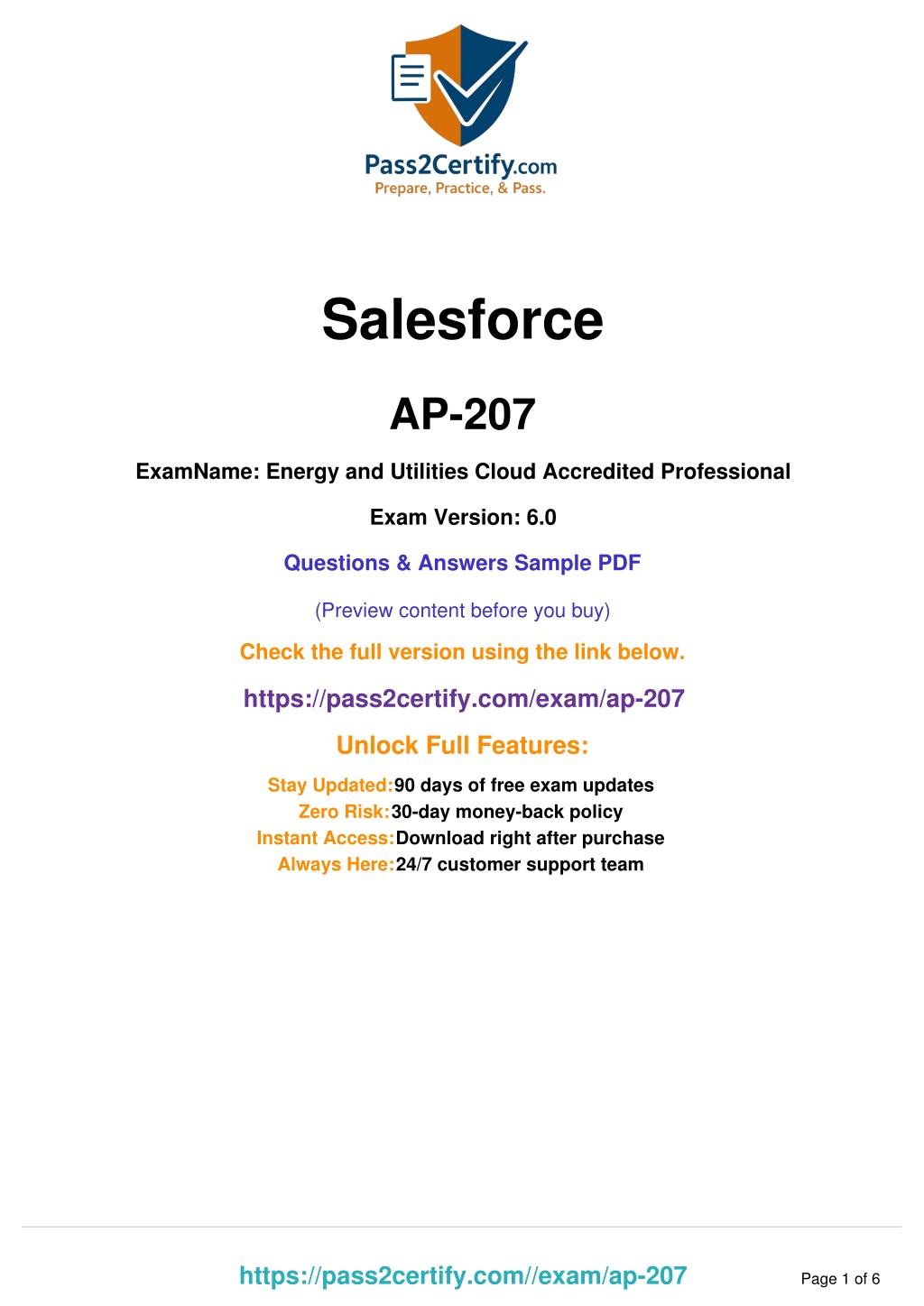 Salesforce AP-207 ExamName: Energy and Utilities Cloud Accredited Professional Exam Version: 6.0 Questions & Answers Sample PDF (Preview content before you buy) Check the full version using the link below. https://pass2certify.com/exam/ap-207 Unlock Full Features: Stay Updated: 90 days of free exam updates Zero Risk: 30-day money-back policy Instant Access: Download right after purchase Always Here: 24/7 customer support team https://pass2certify.com//exam/ap-207 Page 1 of 6