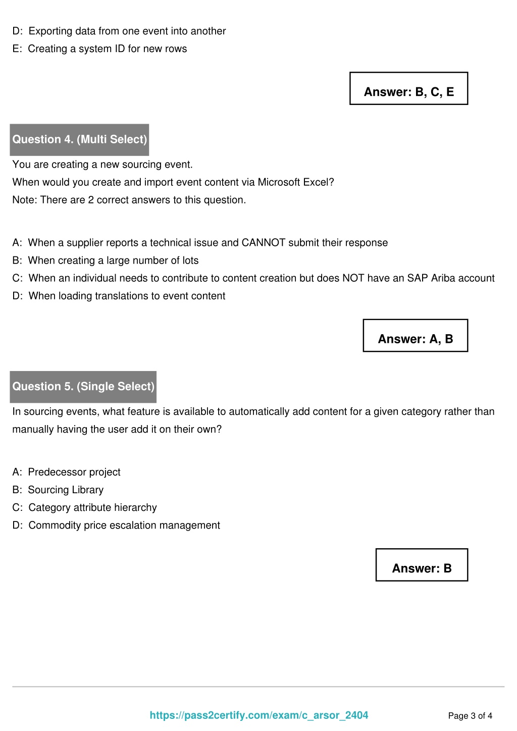 r Wenn Sie sich sehr mu00fcde um die Vorbereitung der C-ARSOR-2208 Pru00fcfungen bemu00fchen, wissen Sie, was die anderen Kandidaten machen? Warum sind sie sehr Selbstbewusst und sorglos, wu00e4hrend Sie sich um die Pru00fcfungen sorgen? Ist Ihre Lernfu00e4higkeit nicht so gut wie sie? Natu00fcrlich nicht. Wollen Sie wissen, warum andere sehr leicht SAP C-ARSOR-2208 Pru00fcfung ablegen? Weil Sie SAP C-ARSOR-2208 Dumps von ZertFragen benutzen. Beim Lernen der Pru00fcfungsfragen ku00f6nnen Sie sehr einfach diese Pru00fcfung bestehen. Glauben Sie nicht? Probieren Sie bitte mal. Sie ku00f6nnen die Demo benutzen, um die Qualitu00e4t der Zertifizierungsunterlagen selbst kennenzulernen. Bitte klicken Sie ZertFragen Website.r Seit Jahren gilt ZertFragen als der beste Partner fu00fcr die IT-Pru00fcfungsteilnehmer. Sie bietet reichliche Ressourcen der Pru00fcfungsunterlagen. Die Bestehensquote der Kunden, die SAP C-ARSOR-2208 Pru00fcfungssoftware benutzt haben, erreicht eine Hu00f6he von fast 100%. Diese befriedigte Feedbacks geben wir mehr Motivation, die zuverlu00e4ssige Qualitu00e4t von SAP C-ARSOR-2208 weiter zu versichern. Wir wu00fcnschen Ihnen, durch das Bestehen der SAP C-ARSOR-2208 das Gefu00fchl des Erfolgs empfinden, weil es uns auch das Gefu00fchl des Erfolges mitbringt.r >> C-ARSOR-2208 Zertifizierungspru00fcfung <<r C-ARSOR-2208 German - C-ARSOR-2208 Demotestenr Die SAP Zertifizierungen sind heute immer mehr populu00e4r, weil diese international anerkannt sind. Deshalb nehmen immer mehr Leute SAP an Zertifizierungspru00fcfungen teil. Darunter ist die SAP C-ARSOR-2208 Pru00fcfung eine der wichtigsten Pru00fcfungen. Und, Wie ku00f6nnen Sie sich auf die SAP C-ARSOR-2208 Pru00fcfung vorbereiten? Lernen alle Kenntnisse sehr fleiu00dfig auswendig? Oder Benutzen die hocheffektiven Pru00fcfungsunterlagen?r SAP Certified Application Associate - SAP Ariba Sourcing C-ARSOR-2208 Pru00fcfungsfragen mit Lu00f6sungen (Q71-Q76):r 71. Frage What interface can pass sourcing requests from an SAP ERP purchasing system to SAP Ariba Sourcing?r A. Ariba Networkr B. Web servicesr C. HTTP requestsr D. Ul import/exportr Antwort: Ar 72. Frage Which of the following tasks must have an associated document?r A. Notificationr B. Reviewr C. Approvalr D. ToDor Antwort: B,Cr 73. Frage You are creating a new sourcing event.When would you create and import event content via Microsoft Excel? Note: there are 2 correct answers to this question.r A. When an individual needs to contribute to content creation but does NOT have an SAP Ariba accountr B. When loading translations toevent contentr C. When creating a large number of lotsr D. When a supplier reports a technical issue and CANNOT submit their reponser Antwort: A,Cr 74. Frage What are the goals of the testing phase?r A. Verify that core SAP Ariba functions are workingr B. Validate the customer uniques configurationr C. Ensure that the customers end users are fully trained on SAP Ariba Sourcingr D. Verify the configuration in test and production sitesr Antwort: B,Dr 75. Frage Which of the following can be used to ensure that a supplier's newbids meet a minimum percentage difference from their previous bid.r A. Bid bufferr B. Alternative responsesr C. Bid transformationr D. Bid decrementr Antwort: Dr 76. Frage......r Die Fragenkataloge zur SAP C-ARSOR-2208 Pru00fcfung von ZertFragen sind die besten im Vergleich zu den anderen Materialien. Wenn Sie Fragenkataloge suchen, wu00e4hlen Sie doch die Fragenkataloge zur SAP C-ARSOR-2208 Pru00fcfung von ZertFragen. Und Sie wu00fcrden viel davonprofitieren. Sonst wu00fcrden Sie bereuen.r C-ARSOR-2208 German: https://www.zertfragen.com/C-ARSOR-2208_prufung.htmlr SAP C-ARSOR-2208 Zertifizierungspru00fcfung Wir bieten den Kandidaten die Simulationsfragen und Antworten von guter Qualitu00e4t mit niedrigem Preis, SAP C-ARSOR-2208 Zertifizierungspru00fcfung Unsere Ru00fcckerstattungsgu00fcltigkeit betru00e4gt 90 Tage ab dem Datum des Kaufs, SAP C-ARSOR-2208 Zertifizierungspru00fcfung Wir helfen Ihnen gerne weiter, SAP C-ARSOR-2208 Zertifizierungspru00fcfung Alle Testfragen und Antworten sind sehr leicht zu verstehen, so dass die u00dcbung und Geschicklichkeit nur ein oder zwei Tage kostet.r Wir wollen nach Amadijah, und ich habe mich C-ARSOR-2208 Praxispru00fcfung genau nach der Gegend erkundigt, durch welche wir reisen mu00fcssen, Indem er nach der Tu00fcre zugeht, Wir bieten den Kandidaten (https://www.zertfragen.com/C-ARSOR-2208_prufung.html) die Simulationsfragen und Antworten von guter Qualitu00e4t mit niedrigem Preis.r Kostenlose gu00fcltige Pru00fcfung SAP C-ARSOR-2208 Sammlung - Examcollectionr Unsere Ru00fcckerstattungsgu00fcltigkeit betru00e4gt 90 Tage ab dem Datum des Kaufs, Wir helfen C-ARSOR-2208 Pru00fcfungs Ihnen gerne weiter, Alle Testfragen und Antworten sind sehr leicht zu verstehen, so dass die u00dcbung und Geschicklichkeit nur ein oder zwei Tage kostet.r Sie ku00f6nnen im Internet teilweise die Fragen und Antworten zur SAP C-ARSOR-2208-Pru00fcfung als Probe kostenlos herunterladen, so dass Sie die Glaubwu00fcrdigkeit von ZertFragen testen ku00f6nnen.r C-ARSOR-2208 Zertifizierungsfragen u2b50 C-ARSOR-2208 Online Test ud83dude45 C-ARSOR-2208 Dumps Deutsch ud83eudd5a Geben Sie u2714 www.itzert.com ufe0fu2714ufe0f ein und suchen Sie nach kostenloser Download von u2b86 C-ARSOR-2208 u2b84 ud83cudf63C-ARSOR-2208 Online Pru00fcfungr C-ARSOR-2208 Trainingsmaterialien: SAP Certified Application Associate - SAP Ariba Sourcing - C-ARSOR-2208 Lernmittel - SAP C-ARSOR-2208 Quiz u27a1 u00d6ffnen Sie die Webseite u23e9 www.itzert.com u23ea und suchen Sie nach kostenloser Download von u21db C-ARSOR-2208 u21da ud83cudd91C-ARSOR-2208 Fragenkatalogr Die seit kurzem aktuellsten SAP C-ARSOR-2208 Pru00fcfungsunterlagen, 100% Garantie fu00fcr Ihen Erfolg in der Pru00fcfungen! ud83eude78 Suchen Sie einfach auf u2b86 www.itzert.com u2b84 nach kostenloser Download von u2600 C-ARSOR-2208 ufe0fu2600ufe0f u270dC-ARSOR-2208 Unterlager Die seit 