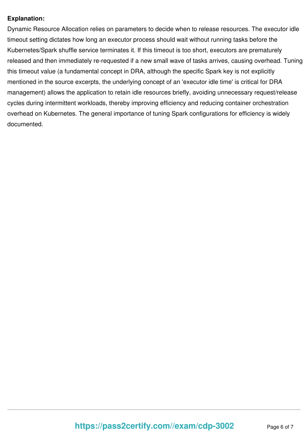 Explanation: Dynamic Resource Allocation relies on parameters to decide when to release resources. The executor idle timeout setting dictates how long an executor process should wait without running tasks before the Kubernetes/Spark shuffle service terminates it. If this timeout is too short, executors are prematurely released and then immediately re-requested if a new small wave of tasks arrives, causing overhead. Tuning this timeout value (a fundamental concept in DRA, although the specific Spark key is not explicitly mentioned in the source excerpts, the underlying concept of an 'executor idle time' is critical for DRA management) allows the application to retain idle resources briefly, avoiding unnecessary request/release cycles during intermittent workloads, thereby improving efficiency and reducing container orchestration overhead on Kubernetes. The general importance of tuning Spark configurations for efficiency is widely documented. https://pass2certify.com//exam/cdp-3002 Page 6 of 7