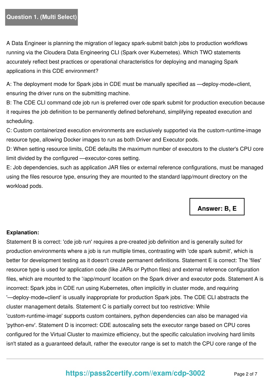 Question 1. (Multi Select) A Data Engineer is planning the migration of legacy spark-submit batch jobs to production workflows running via the Cloudera Data Engineering CLI (Spark over Kubernetes). Which TWO statements accurately reflect best practices or operational characteristics for deploying and managing Spark applications in this CDE environment? A: The deployment mode for Spark jobs in CDE must be manually specified as —deploy-mode=client, ensuring the driver runs on the submitting machine. B: The CDE CLI command cde job run is preferred over cde spark submit for production execution because it requires the job definition to be permanently defined beforehand, simplifying repeated execution and scheduling. C: Custom containerized execution environments are exclusively supported via the custom-runtime-image resource type, allowing Docker images to run as both Driver and Executor pods. D: When setting resource limits, CDE defaults the maximum number of executors to the cluster's CPU core limit divided by the configured —executor-cores setting. E: Job dependencies, such as application JAR files or external reference configurations, must be managed using the files resource type, ensuring they are mounted to the standard lapp/mount directory on the workload pods. Answer: B, E Explanation: Statement B is correct: 'cde job run' requires a pre-created job definition and is generally suited for production environments where a job is run multiple times, contrasting with 'cde spark submit', which is better for development testing as it doesn't create permanent definitions. Statement E is correct: The 'files' resource type is used for application code (like JARs or Python files) and external reference configuration files, which are mounted to the '/app/mount' location on the Spark driver and executor pods. Statement A is incorrect: Spark jobs in CDE run using Kubernetes, often implicitly in cluster mode, and requiring '—deploy-mode=client' is usually inappropriate for production Spark jobs. The CDE CLI abstracts the cluster management details. Statement C is partially correct but too restrictive: While 'custom-runtime-image' supports custom containers, python dependencies can also be managed via 'python-env'. Statement D is incorrect: CDE autoscaling sets the executor range based on CPU cores configured for the Virtual Cluster to maximize efficiency, but the specific calculation involving hard limits isn't stated as a guaranteed default, rather the executor range is set to match the CPU core range of the https://pass2certify.com//exam/cdp-3002 Page 2 of 7