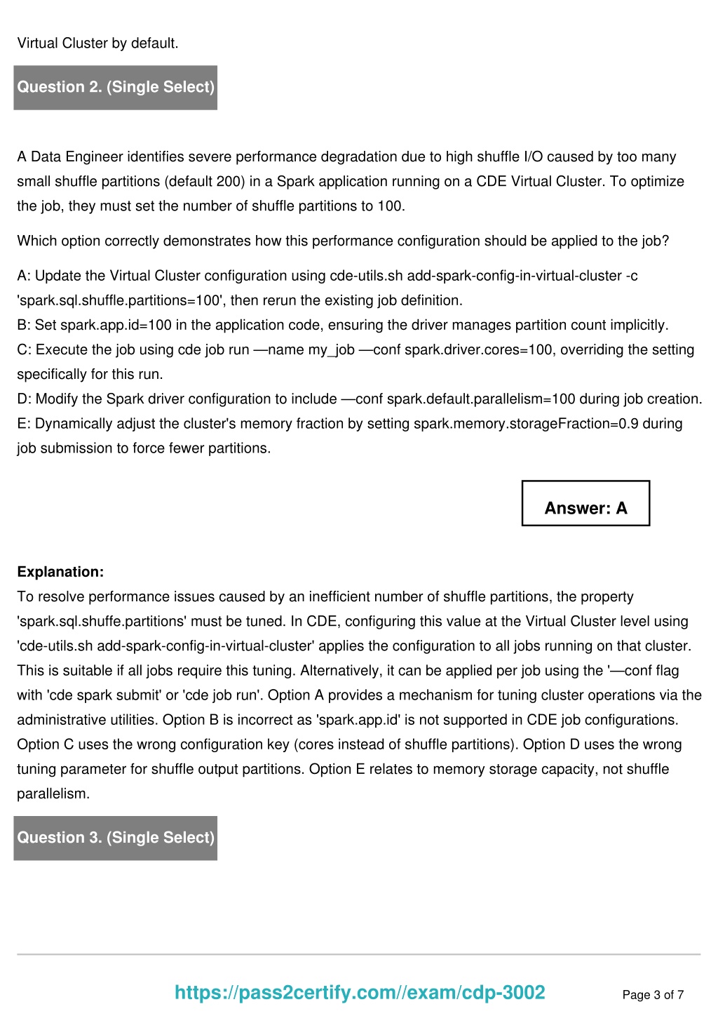 Virtual Cluster by default. Question 2. (Single Select) A Data Engineer identifies severe performance degradation due to high shuffle I/O caused by too many small shuffle partitions (default 200) in a Spark application running on a CDE Virtual Cluster. To optimize the job, they must set the number of shuffle partitions to 100. Which option correctly demonstrates how this performance configuration should be applied to the job? A: Update the Virtual Cluster configuration using cde-utils.sh add-spark-config-in-virtual-cluster -c 'spark.sql.shuffle.partitions=100', then rerun the existing job definition. B: Set spark.app.id=100 in the application code, ensuring the driver manages partition count implicitly. C: Execute the job using cde job run —name my_job —conf spark.driver.cores=100, overriding the setting specifically for this run. D: Modify the Spark driver configuration to include —conf spark.default.parallelism=100 during job creation. E: Dynamically adjust the cluster's memory fraction by setting spark.memory.storageFraction=0.9 during job submission to force fewer partitions. Answer: A Explanation: To resolve performance issues caused by an inefficient number of shuffle partitions, the property 'spark.sql.shuffe.partitions' must be tuned. In CDE, configuring this value at the Virtual Cluster level using 'cde-utils.sh add-spark-config-in-virtual-cluster' applies the configuration to all jobs running on that cluster. This is suitable if all jobs require this tuning. Alternatively, it can be applied per job using the '—conf flag with 'cde spark submit' or 'cde job run'. Option A provides a mechanism for tuning cluster operations via the administrative utilities. Option B is incorrect as 'spark.app.id' is not supported in CDE job configurations. Option C uses the wrong configuration key (cores instead of shuffle partitions). Option D uses the wrong tuning parameter for shuffle output partitions. Option E relates to memory storage capacity, not shuffle parallelism. Question 3. (Single Select) https://pass2certify.com//exam/cdp-3002 Page 3 of 7