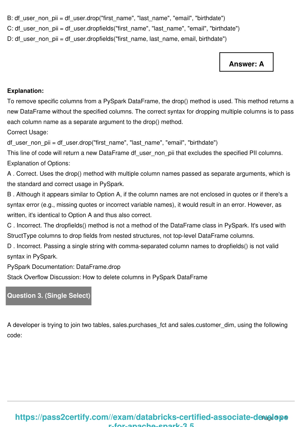 B: df_user_non_pii = df_user.drop("first_name", "last_name", "email", "birthdate") C: df_user_non_pii = df_user.dropfields("first_name", "last_name", "email", "birthdate") D: df_user_non_pii = df_user.dropfields("first_name, last_name, email, birthdate") Answer: A Explanation: To remove specific columns from a PySpark DataFrame, the drop() method is used. This method returns a new DataFrame without the specified columns. The correct syntax for dropping multiple columns is to pass each column name as a separate argument to the drop() method. Correct Usage: df_user_non_pii = df_user.drop("first_name", "last_name", "email", "birthdate") This line of code will return a new DataFrame df_user_non_pii that excludes the specified PII columns. Explanation of Options: A . Correct. Uses the drop() method with multiple column names passed as separate arguments, which is the standard and correct usage in PySpark. B . Although it appears similar to Option A, if the column names are not enclosed in quotes or if there's a syntax error (e.g., missing quotes or incorrect variable names), it would result in an error. However, as written, it's identical to Option A and thus also correct. C . Incorrect. The dropfields() method is not a method of the DataFrame class in PySpark. It's used with StructType columns to drop fields from nested structures, not top-level DataFrame columns. D . Incorrect. Passing a single string with comma-separated column names to dropfields() is not valid syntax in PySpark. PySpark Documentation: DataFrame.drop Stack Overflow Discussion: How to delete columns in PySpark DataFrame Question 3. (Single Select) A developer is trying to join two tables, sales.purchases_fct and sales.customer_dim, using the following code: https://pass2certify.com//exam/databricks-certified-associate-develope r-for-apache-spark-3.5 Page 3 of 9