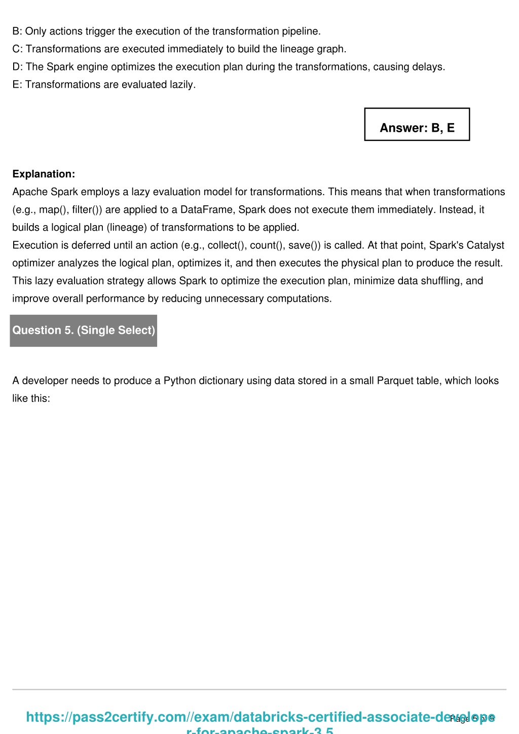 B: Only actions trigger the execution of the transformation pipeline. C: Transformations are executed immediately to build the lineage graph. D: The Spark engine optimizes the execution plan during the transformations, causing delays. E: Transformations are evaluated lazily. Answer: B, E Explanation: Apache Spark employs a lazy evaluation model for transformations. This means that when transformations (e.g., map(), filter()) are applied to a DataFrame, Spark does not execute them immediately. Instead, it builds a logical plan (lineage) of transformations to be applied. Execution is deferred until an action (e.g., collect(), count(), save()) is called. At that point, Spark's Catalyst optimizer analyzes the logical plan, optimizes it, and then executes the physical plan to produce the result. This lazy evaluation strategy allows Spark to optimize the execution plan, minimize data shuffling, and improve overall performance by reducing unnecessary computations. Question 5. (Single Select) A developer needs to produce a Python dictionary using data stored in a small Parquet table, which looks like this: https://pass2certify.com//exam/databricks-certified-associate-develope r-for-apache-spark-3.5 Page 5 of 9