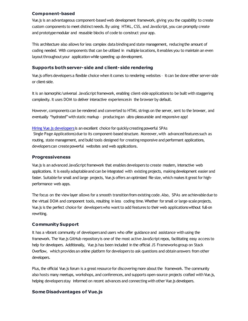 Component-based Vue.js is an advantageous component-based web development framework, giving you the capability to create custom components to meet distinct needs. By using HTML, CSS, and JavaScript, you can promptly create and prototype modular and reusable blocks ofcodeto construct yourapp. This architecture also allows for less complex data binding and state management, reducing the amount of coding needed. With components that can be utilized in multiple locations, it enables you to maintain an even layout throughout your applicationwhile speeding updevelopment. Supports bothserver-side and client-side rendering Vue.js offers developers a flexible choice when it comes to rendering websites – it can bedone either server-side orclient-side. It is an isomorphic/universal JavaScript framework, enabling client-side applications to be built with staggering complexity. It uses DOM to deliver interactive experiences in the browserby default. However, componentscan berendered andconvertedto HTML strings on the server, sent to the browser, and eventually “hydrated” with static markup – producing an ultra-pleasurable and responsive app! Hiring Vue.js developersis anexcellent choiceforquickly creating powerful SPAs Single Page Applications) due to its component-based structure. Moreover, with advanced features such as routing, state management, and build tools designed for creating responsive and performant applications, developers can create powerful websites and web applications. Progressiveness Vue.js is anadvancedJavaScriptframework that enablesdevelopersto create modern, interactive web applications. It is easilyadaptableandcanbeintegrated with existing projects, making development easier and faster. Suitable for small and large projects, Vue.js offers an optimized file size, which makes it great for high- performance web apps. The focus on the view layer allows for a smooth transition from existing code. Also, SPAs are achievable due to the virtual DOM and component tools, resulting in less coding time.Whether forsmall orlarge-scaleprojects, Vue.js is the perfect choicefor developers who want to add features to their web applications without full-on rewriting. CommunitySupport It has a vibrant community of developers andusers who offer guidanceand assistance with using the framework. The Vue.js GitHub repository is one of the most active JavaScript repos, facilitating easy access to help for developers. Additionally, Vue.js has been included in the official JS Frameworks group on Stack Overflow, whichprovidesanonline platform fordevelopersto ask questions andobtainanswers fromother developers. Plus, the official Vue.js forum is a great resource for discovering more about the framework. The community also hosts many meetups, workshops, and conferences, and supports open-source projects crafted with Vue.js, helping developers stay informed on recent advancesandconnectingwithotherVue.js developers. SomeDisadvantages of Vue.js