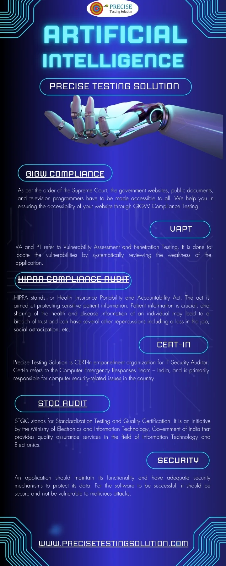 PRECISE TESTING SOLUTION GIGW COMPLIANCE As per the order of the Supreme Court, the government websites, public documents, and television programmers have to be made accessible to all. We help you in ensuring the accessibility of your website through GIGW Compliance Testing. VAPT VA and PT refer to Vulnerability Assessment and Penetration Testing. It is done to locate the vulnerabilities by systematically reviewing the weakness of the application. HIPAA COMPLIANCE AUDIT HIPPA stands for Health Insurance Portability and Accountability Act. The act is aimed at protecting sensitive patient information. Patient information is crucial, and sharing of the health and disease information of an individual may lead to a breach of trust and can have several other repercussions including a loss in the job, social ostracization, etc. CERT-IN Precise Testing Solution is CERT-In empanelment organization for IT Security Auditor. Cert-In refers to the Computer Emergency Responses Team – India, and is primarily responsible for computer security-related issues in the country. STQC AUDIT STQC stands for Standardization Testing and Quality Certification. It is an initiative by the Ministry of Electronics and Information Technology, Government of India that provides quality assurance services in the field of Information Technology and Electronics. SECURITY An application should maintain its functionality and have adequate security mechanisms to protect its data. For the software to be successful, it should be secure and not be vulnerable to malicious attacks. WWW.PRECISETESTINGSOLUTION.COM