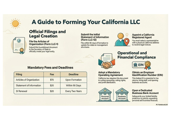 How to Register an LLC in California<br><br>Step 1: Appoint a Registered Agent<br><br>Step 2: File the Articles of Organization<br><br>Step 3: Register for State Taxes<br><br>Step 4: File the Initial Statement of Information<br><br>Step 5: Adopt an Operating Agreement<br><br>Step 6: Obtain an EIN<br><br>Step 7: Open a Business Bank Account<br><br>Website link : https://formllc.us/blogs/california-llc-registration