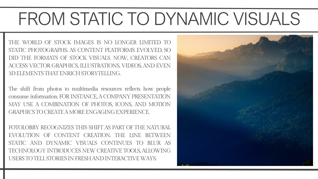 6. FROM STATIC TO DYNAMIC VISUALS THE WORLD OF STOCK IMAGES IS NO LONGER LIMITED TO STATIC PHOTOGRAPHS. AS CONTENT PLATFORMS EVOLVED, SO DID THE FORMATS OF STOCK VISUALS. NOW, CREATORS CAN ACCESS VECTOR GRAPHICS, ILLUSTRATIONS, VIDEOS, AND EVEN 3D ELEMENTS THAT ENRICH STORYTELLING. The shift from photos to multimedia resources reflects how people consume information. FOR INSTANCE, A COMPANY PRESENTATION MAY USE A COMBINATION OF PHOTOS, ICONS, AND MOTION GRAPHICS TO CREATE A MORE ENGAGING EXPERIENCE. FOTOLOBBY RECOGNIZES THIS SHIFT AS PART OF THE NATURAL EVOLUTION OF CONTENT CREATION. THE LINE BETWEEN STATIC AND DYNAMIC VISUALS CONTINUES TO BLUR AS TECHNOLOGY INTRODUCES NEW CREATIVE TOOLS, ALLOWING USERS TO TELL STORIES IN FRESH AND INTERACTIVE WAYS.