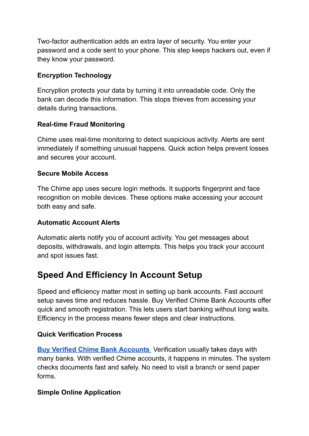 4. Two-factor authentication adds an extra layer of security. You enter your password and a code sent to your phone. This step keeps hackers out, even if they know your password. Encryption Technology Encryption protects your data by turning it into unreadable code. Only the bank can decode this information. This stops thieves from accessing your details during transactions. Real-time Fraud Monitoring Chime uses real-time monitoring to detect suspicious activity. Alerts are sent immediately if something unusual happens. Quick action helps prevent losses and secures your account. Secure Mobile Access The Chime app uses secure login methods. It supports fingerprint and face recognition on mobile devices. These options make accessing your account both easy and safe. Automatic Account Alerts Automatic alerts notify you of account activity. You get messages about deposits, withdrawals, and login attempts. This helps you track your account and spot issues fast. Speed And Efficiency In Account Setup Speed and efficiency matter most in setting up bank accounts. Fast account setup saves time and reduces hassle. Buy Verified Chime Bank Accounts offer quick and smooth registration. This lets users start banking without long waits. Efficiency in the process means fewer steps and clear instructions. Quick Verification Process Buy Verified Chime Bank Accounts Verification usually takes days with many banks. With verified Chime accounts, it happens in minutes. The system checks documents fast and safely. No need to visit a branch or send paper forms. Simple Online Application