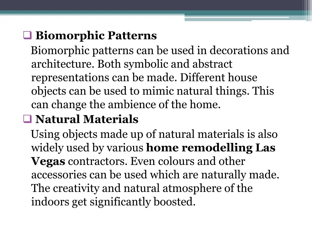 Biomorphic Patterns Biomorphic patterns can be used in decorations and architecture. Both symbolic and abstract representations can be made. Different house objects can be used to mimic natural things. This can change the ambience of the home. • Natural Materials Using objects made up of natural materials is also widely used by various home remodelling Las Vegas contractors. Even colours and other accessories can be used which are naturally made. The creativity and natural atmosphere of the indoors get significantly boosted.