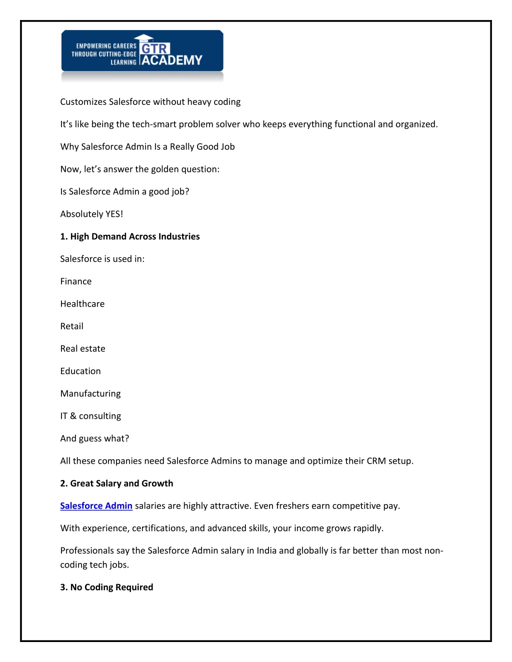 Customizes Salesforce without heavy coding It’s like being the tech-smart problem solver who keeps everything functional and organized. Why Salesforce Admin Is a Really Good Job Now, let’s answer the golden question: Is Salesforce Admin a good job? Absolutely YES! 1. High Demand Across Industries Salesforce is used in: Finance Healthcare Retail Real estate Education Manufacturing IT & consulting And guess what? All these companies need Salesforce Admins to manage and optimize their CRM setup. 2. Great Salary and Growth Salesforce Admin salaries are highly attractive. Even freshers earn competitive pay. With experience, certifications, and advanced skills, your income grows rapidly. Professionals say the Salesforce Admin salary in India and globally is far better than most non- coding tech jobs. 3. No Coding Required