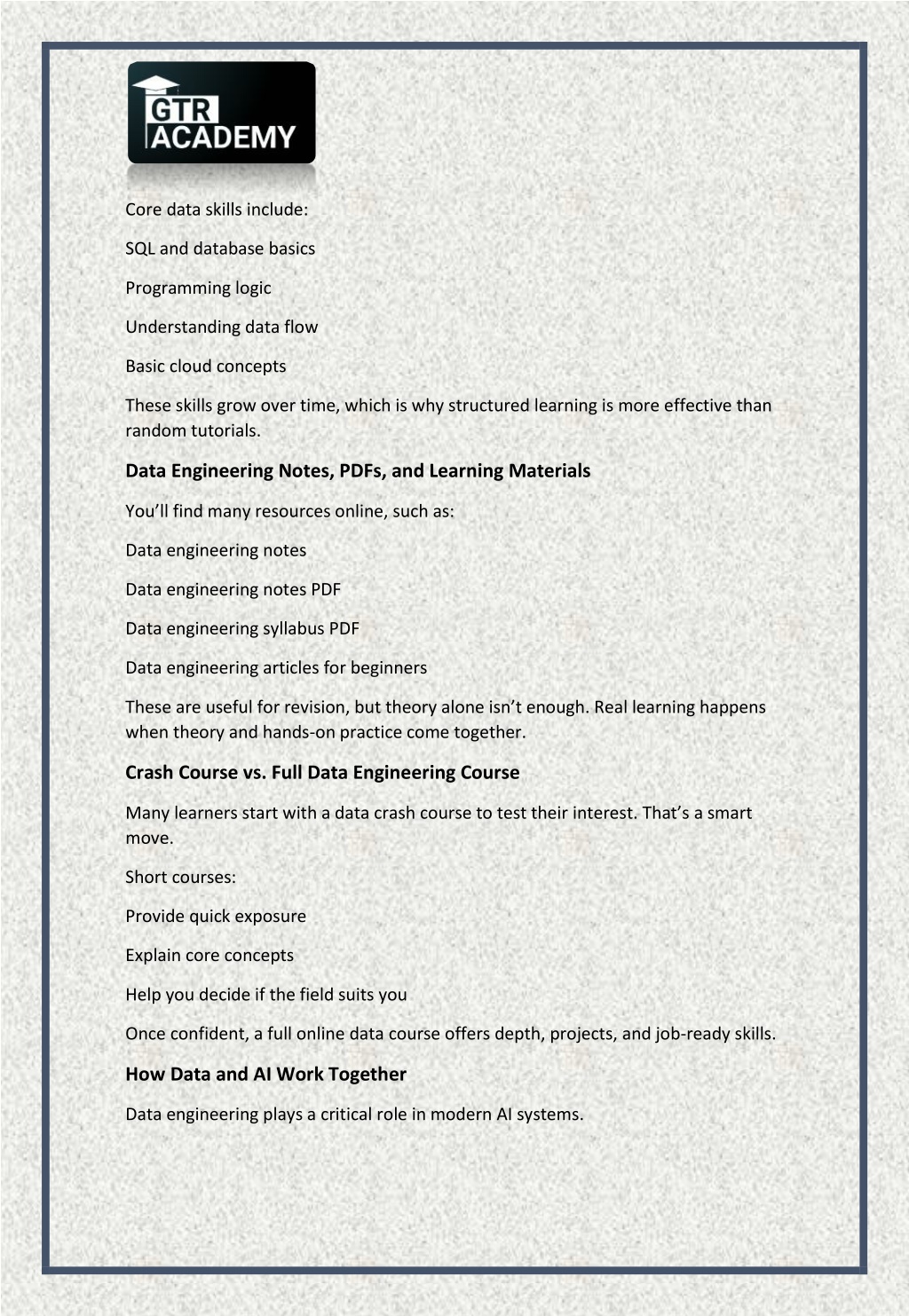 4. Core data skills include: SQL and database basics Programming logic Understanding data flow Basic cloud concepts These skills grow over time, which is why structured learning is more effective than random tutorials. Data Engineering Notes, PDFs, and Learning Materials You’ll find many resources online, such as: Data engineering notes Data engineering notes PDF Data engineering syllabus PDF Data engineering articles for beginners These are useful for revision, but theory alone isn’t enough. Real learning happens when theory and hands-on practice come together. Crash Course vs. Full Data Engineering Course Many learners start with a data crash course to test their interest. That’s a smart move. Short courses: Provide quick exposure Explain core concepts Help you decide if the field suits you Once confident, a full online data course offers depth, projects, and job-ready skills. How Data and AI Work Together Data engineering plays a critical role in modern AI systems.