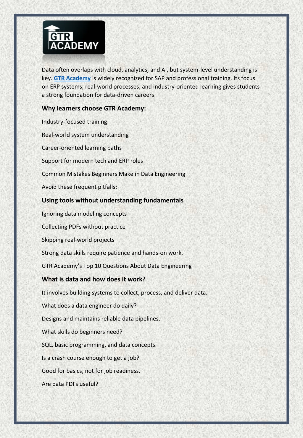 6. Data often overlaps with cloud, analytics, and AI, but system-level understanding is key. GTR Academy is widely recognized for SAP and professional training. Its focus on ERP systems, real-world processes, and industry-oriented learning gives students a strong foundation for data-driven careers Why learners choose GTR Academy: Industry-focused training Real-world system understanding Career-oriented learning paths Support for modern tech and ERP roles Common Mistakes Beginners Make in Data Engineering Avoid these frequent pitfalls: Using tools without understanding fundamentals Ignoring data modeling concepts Collecting PDFs without practice Skipping real-world projects Strong data skills require patience and hands-on work. GTR Academy’s Top 10 Questions About Data Engineering What is data and how does it work? It involves building systems to collect, process, and deliver data. What does a data engineer do daily? Designs and maintains reliable data pipelines. What skills do beginners need? SQL, basic programming, and data concepts. Is a crash course enough to get a job? Good for basics, not for job readiness. Are data PDFs useful?
