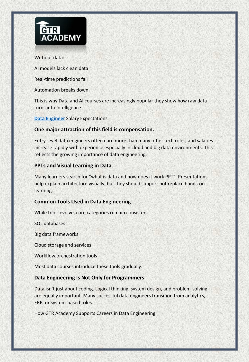 5. Without data: AI models lack clean data Real-time predictions fail Automation breaks down This is why Data and AI courses are increasingly popular they show how raw data turns into intelligence. Data Engineer Salary Expectations One major attraction of this field is compensation. Entry-level data engineers often earn more than many other tech roles, and salaries increase rapidly with experience especially in cloud and big data environments. This reflects the growing importance of data engineering. PPTs and Visual Learning in Data Many learners search for “what is data and how does it work PPT”. Presentations help explain architecture visually, but they should support not replace hands-on learning. Common Tools Used in Data Engineering While tools evolve, core categories remain consistent: SQL databases Big data frameworks Cloud storage and services Workflow orchestration tools Most data courses introduce these tools gradually. Data Engineering Is Not Only for Programmers Data isn’t just about coding. Logical thinking, system design, and problem-solving are equally important. Many successful data engineers transition from analytics, ERP, or system-based roles. How GTR Academy Supports Careers in Data Engineering
