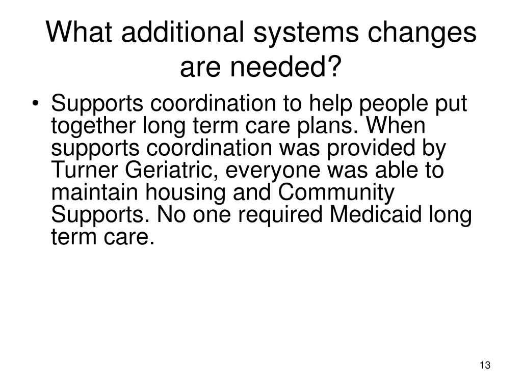 What additional systems changes are needed? • Supports coordination to help people put together long term care plans. When supports coordination was provided by Turner Geriatric, everyone was able to maintain housing and Community Supports. No one required Medicaid long term care.