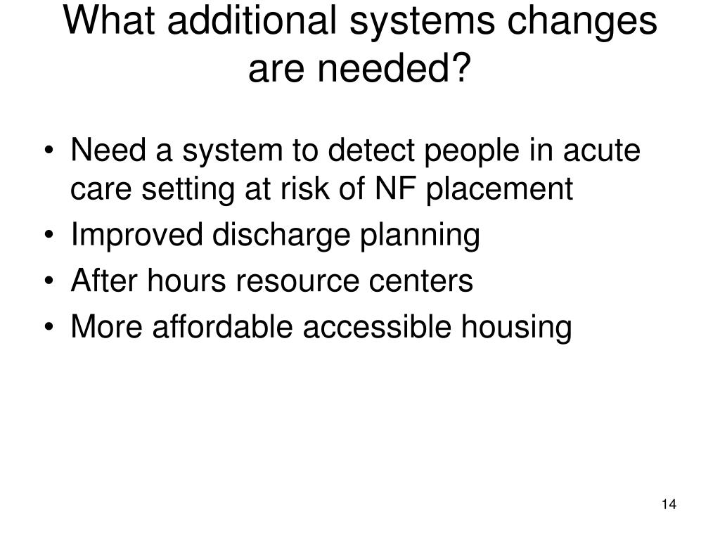What additional systems changes are needed? • Need a system to detect people in acute care setting at risk of NF placement • Improved discharge planning • After hours resource centers • More affordable accessible housing