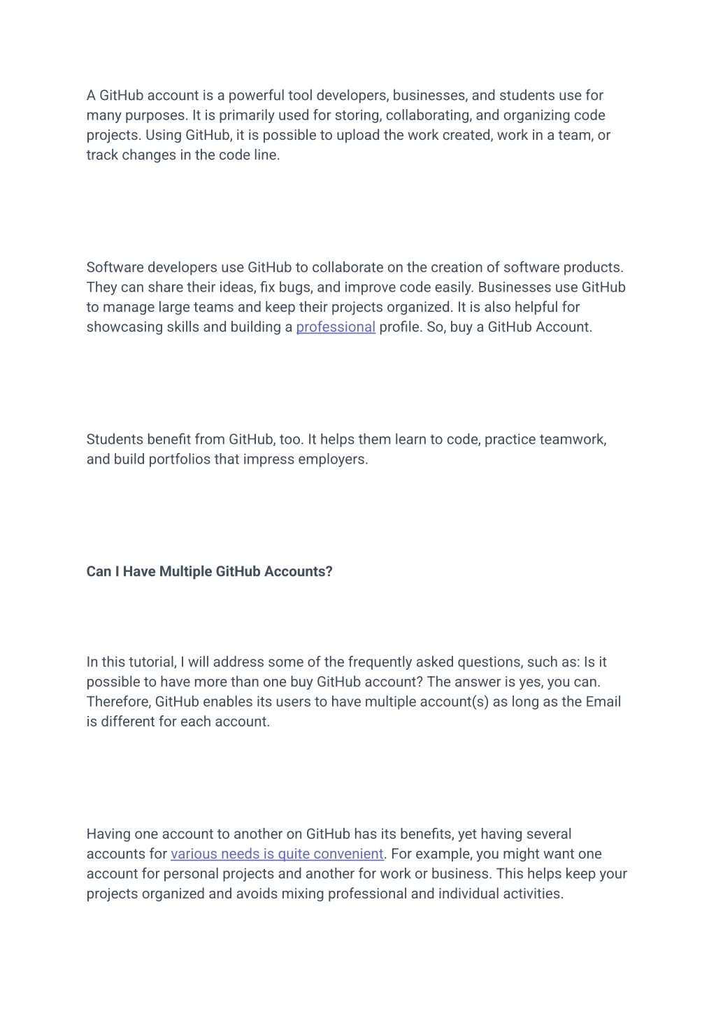 A GitHub account is a powerful tool developers, businesses, and students use for many purposes. It is primarily used for storing, collaborating, and organizing code projects. Using GitHub, it is possible to upload the work created, work in a team, or track changes in the code line. Software developers use GitHub to collaborate on the creation of software products. They can share their ideas, fix bugs, and improve code easily. Businesses use GitHub to manage large teams and keep their projects organized. It is also helpful for showcasing skills and building a professional profile. So, buy a GitHub Account. Students benefit from GitHub, too. It helps them learn to code, practice teamwork, and build portfolios that impress employers. Can I Have Multiple GitHub Accounts? In this tutorial, I will address some of the frequently asked questions, such as: Is it possible to have more than one buy GitHub account? The answer is yes, you can. Therefore, GitHub enables its users to have multiple account(s) as long as the Email is different for each account. Having one account to another on GitHub has its benefits, yet having several accounts for various needs is quite convenient. For example, you might want one account for personal projects and another for work or business. This helps keep your projects organized and avoids mixing professional and individual activities.
