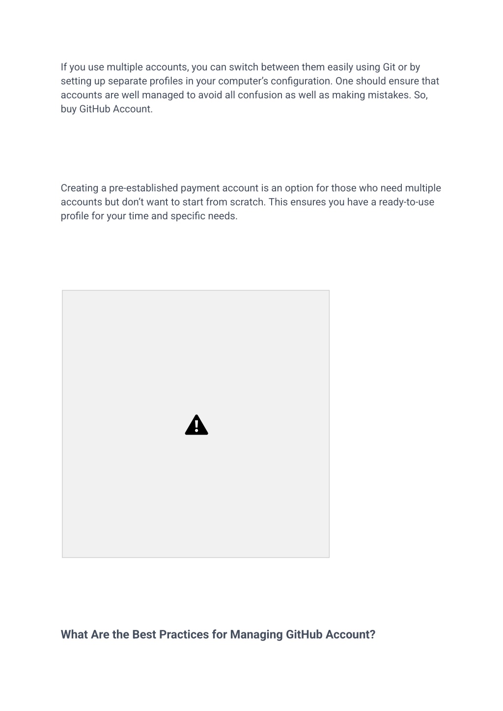 If you use multiple accounts, you can switch between them easily using Git or by setting up separate profiles in your computer’s configuration. One should ensure that accounts are well managed to avoid all confusion as well as making mistakes. So, buy GitHub Account. Creating a pre-established payment account is an option for those who need multiple accounts but don’t want to start from scratch. This ensures you have a ready-to-use profile for your time and specific needs. What Are the Best Practices for Managing GitHub Account?