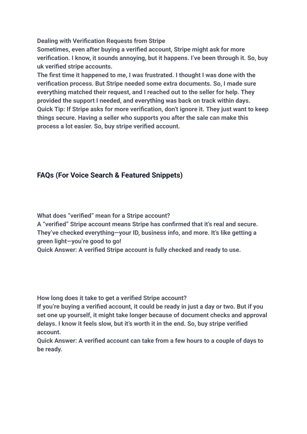 Dealing with Verification Requests from Stripe Sometimes, even after buying a verified account, Stripe might ask for more verification. I know, it sounds annoying, but it happens. I’ve been through it. So, buy uk verified stripe accounts. The first time it happened to me, I was frustrated. I thought I was done with the verification process. But Stripe needed some extra documents. So, I made sure everything matched their request, and I reached out to the seller for help. They provided the support I needed, and everything was back on track within days. Quick Tip: If Stripe asks for more verification, don’t ignore it. They just want to keep things secure. Having a seller who supports you after the sale can make this process a lot easier. So, buy stripe verified account. FAQs (For Voice Search & Featured Snippets) What does “verified” mean for a Stripe account? A “verified” Stripe account means Stripe has confirmed that it’s real and secure. They’ve checked everything—your ID, business info, and more. It’s like getting a green light—you’re good to go! Quick Answer: A verified Stripe account is fully checked and ready to use. How long does it take to get a verified Stripe account? If you’re buying a verified account, it could be ready in just a day or two. But if you set one up yourself, it might take longer because of document checks and approval delays. I know it feels slow, but it’s worth it in the end. So, buy stripe verified account. Quick Answer: A verified account can take from a few hours to a couple of days to be ready.