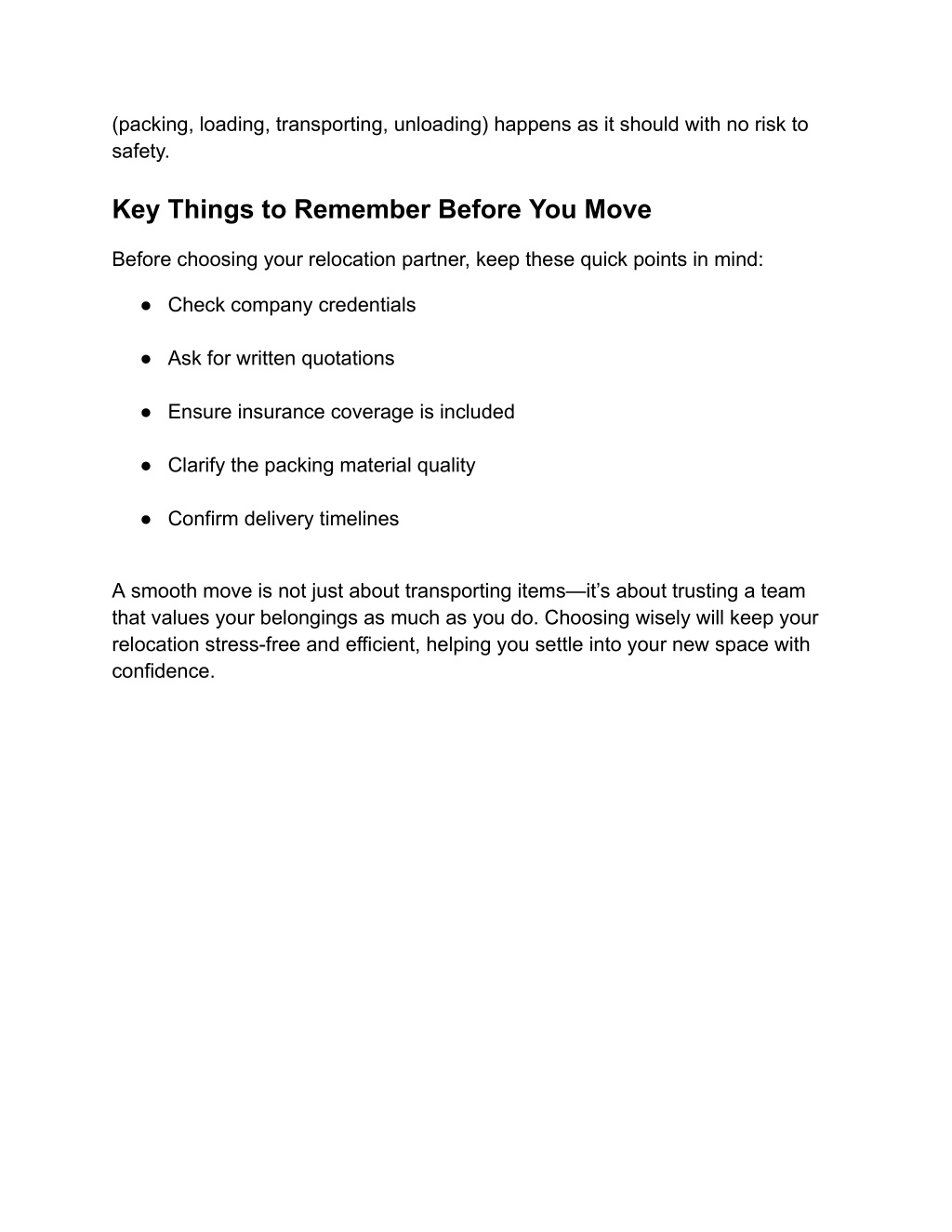 (packing, loading, transporting, unloading) happens as it should with no risk to safety. Key Things to Remember Before You Move Before choosing your relocation partner, keep these quick points in mind: ● Check company credentials ● Ask for written quotations ● Ensure insurance coverage is included ● Clarify the packing material quality ● Confirm delivery timelines A smooth move is not just about transporting items—it’s about trusting a team that values your belongings as much as you do. Choosing wisely will keep your relocation stress-free and efficient, helping you settle into your new space with confidence.
