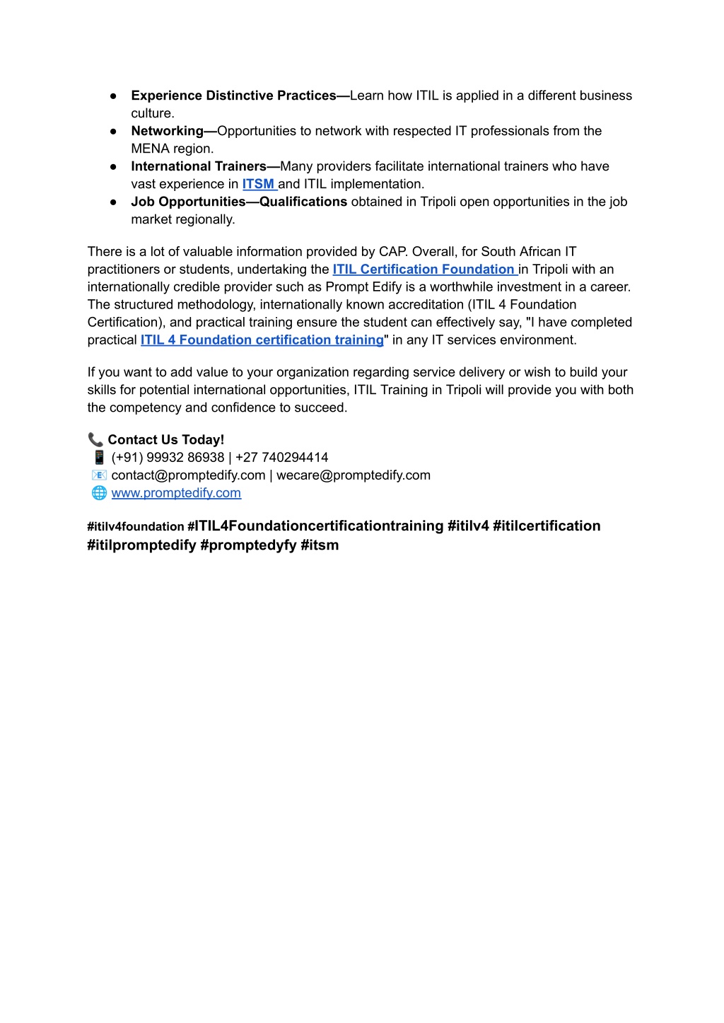 ● Experience Distinctive Practices—Learn how ITIL is applied in a different business culture. ● Networking—Opportunities to network with respected IT professionals from the MENA region. ● International Trainers—Many providers facilitate international trainers who have vast experience in ITSM and ITIL implementation. ● Job Opportunities—Qualifications obtained in Tripoli open opportunities in the job market regionally. There is a lot of valuable information provided by CAP. Overall, for South African IT practitioners or students, undertaking the ITIL Certification Foundation in Tripoli with an internationally credible provider such as Prompt Edify is a worthwhile investment in a career. The structured methodology, internationally known accreditation (ITIL 4 Foundation Certification), and practical training ensure the student can effectively say, "I have completed practical ITIL 4 Foundation certification training" in any IT services environment. If you want to add value to your organization regarding service delivery or wish to build your skills for potential international opportunities, ITIL Training in Tripoli will provide you with both the competency and confidence to succeed. ?Contact Us Today! ? (+91) 99932 86938 | +27 740294414 ? contact@promptedify.com | wecare@promptedify.com ?www.promptedify.com #itilv4foundation #ITIL4Foundationcertificationtraining #itilv4 #itilcertification #itilpromptedify #promptedyfy #itsm