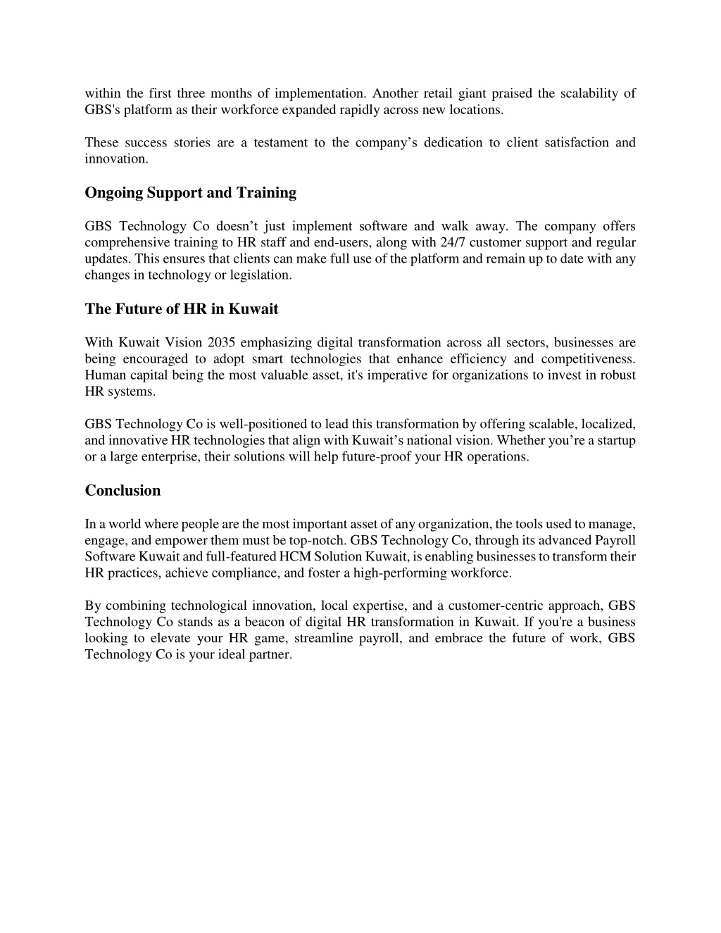 within the first three months of implementation. Another retail giant praised the scalability of GBS's platform as their workforce expanded rapidly across new locations. These success stories are a testament to the company’s dedication to client satisfaction and innovation. Ongoing Support and Training GBS Technology Co doesn’t just implement software and walk away. The company offers comprehensive training to HR staff and end-users, along with 24/7 customer support and regular updates. This ensures that clients can make full use of the platform and remain up to date with any changes in technology or legislation. The Future of HR in Kuwait With Kuwait Vision 2035 emphasizing digital transformation across all sectors, businesses are being encouraged to adopt smart technologies that enhance efficiency and competitiveness. Human capital being the most valuable asset, it's imperative for organizations to invest in robust HR systems. GBS Technology Co is well-positioned to lead this transformation by offering scalable, localized, and innovative HR technologies that align with Kuwait’s national vision. Whether you’re a startup or a large enterprise, their solutions will help future-proof your HR operations. Conclusion In a world where people are the most important asset of any organization, the tools used to manage, engage, and empower them must be top-notch. GBS Technology Co, through its advanced Payroll Software Kuwait and full-featured HCM Solution Kuwait, is enabling businesses to transform their HR practices, achieve compliance, and foster a high-performing workforce. By combining technological innovation, local expertise, and a customer-centric approach, GBS Technology Co stands as a beacon of digital HR transformation in Kuwait. If you're a business looking to elevate your HR game, streamline payroll, and embrace the future of work, GBS Technology Co is your ideal partner.