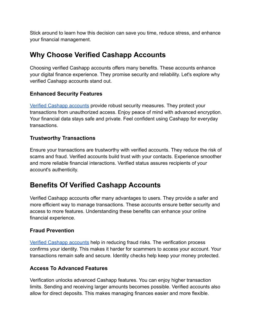 Stick around to learn how this decision can save you time, reduce stress, and enhance your financial management. Why Choose Verified Cashapp Accounts Choosing verified Cashapp accounts offers many benefits. These accounts enhance your digital finance experience. They promise security and reliability. Let's explore why verified Cashapp accounts stand out. Enhanced Security Features Verified Cashapp accounts provide robust security measures. They protect your transactions from unauthorized access. Enjoy peace of mind with advanced encryption. Your financial data stays safe and private. Feel confident using Cashapp for everyday transactions. Trustworthy Transactions Ensure your transactions are trustworthy with verified accounts. They reduce the risk of scams and fraud. Verified accounts build trust with your contacts. Experience smoother and more reliable financial interactions. Verified status assures recipients of your account's authenticity. Benefits Of Verified Cashapp Accounts Verified Cashapp accounts offer many advantages to users. They provide a safer and more efficient way to manage transactions. These accounts ensure better security and access to more features. Understanding these benefits can enhance your online financial experience. Fraud Prevention Verified Cashapp accounts help in reducing fraud risks. The verification process confirms your identity. This makes it harder for scammers to access your account. Your transactions remain safe and secure. Identity checks help keep your money protected. Access To Advanced Features Verification unlocks advanced Cashapp features. You can enjoy higher transaction limits. Sending and receiving larger amounts becomes possible. Verified accounts also allow for direct deposits. This makes managing finances easier and more flexible.