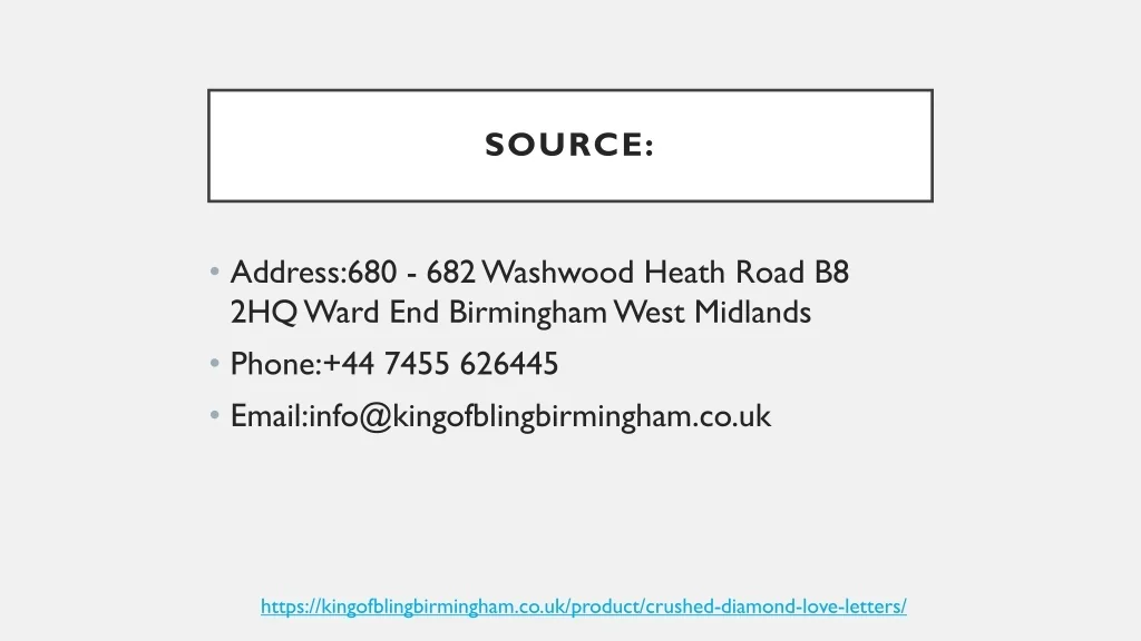SOURCE: • Address:680 - 682 Washwood Heath Road B8 2HQ Ward End Birmingham West Midlands • Phone:+44 7455 626445 • Email:info@kingofblingbirmingham.co.uk https://kingofblingbirmingham.co.uk/product/crushed-diamond-love-letters/