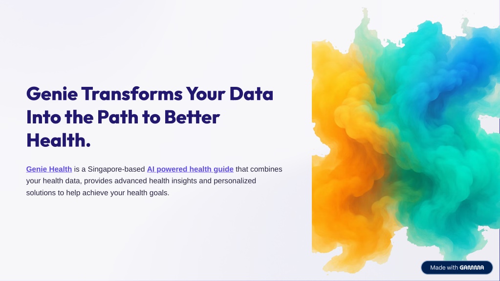 9. Why Choose Genie Health? Your personalized, AI-powered health guide. Built here in Singapore. Your Health Data in One Locker Genie unifies your medical reports, lab results, and wearable data into one secure Health Locker for easy access. Built for Singapore Designed with local health trends, habits and realities in mind, aligned with regional medical standards and data privacy laws. Insights That Speak Human Genie translates numbers into clear, personalized insights that help you focus on what needs attention and why it matters. Personalized Health Journeys Genie uses your data, habits, and goals to build a living, adaptive roadmap that evolves with you.