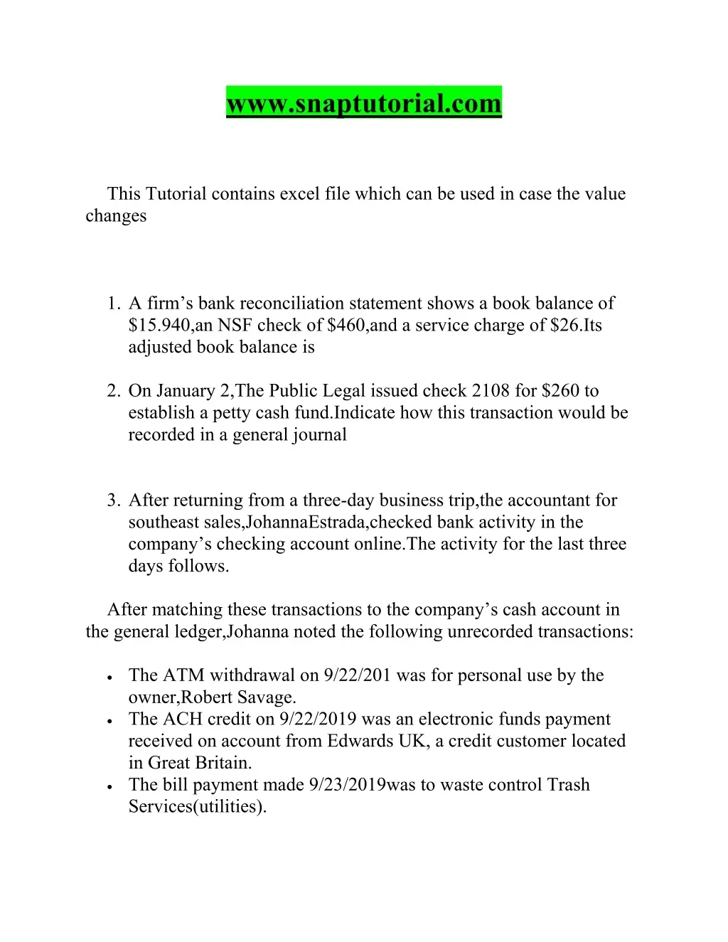 www.snaptutorial.com This Tutorial contains excel file which can be used in case the value changes 1. A firm’s bank reconciliation statement shows a book balance of $15.940,an NSF check of $460,and a service charge of $26.Its adjusted book balance is 2. On January 2,The Public Legal issued check 2108 for $260 to establish a petty cash fund.Indicate how this transaction would be recorded in a general journal 3. After returning from a three-day business trip,the accountant for southeast sales,JohannaEstrada,checked bank activity in the company’s checking account online.The activity for the last three days follows. After matching these transactions to the company’s cash account in the general ledger,Johanna noted the following unrecorded transactions: The ATM withdrawal on 9/22/201 was for personal use by the owner,Robert Savage. The ACH credit on 9/22/2019 was an electronic funds payment received on account from Edwards UK, a credit customer located in Great Britain. The bill payment made 9/23/2019was to waste control Trash Services(utilities).