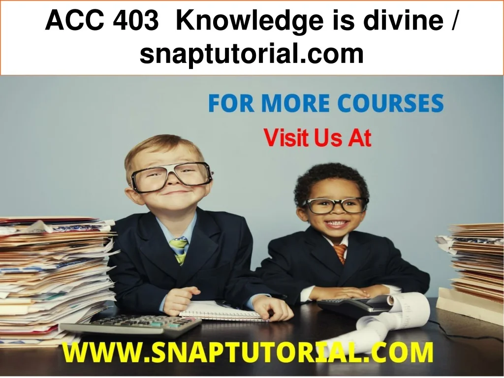 ACC 403 Knowledge is divine / snaptutorial.com ACC 403 Week 2 Quiz 1 For more classes visit www.snaptutorial.com 1. The most common way for users to obtain reliable information is to: 2. The three requirements for becoming a CPA include all but which of the following?