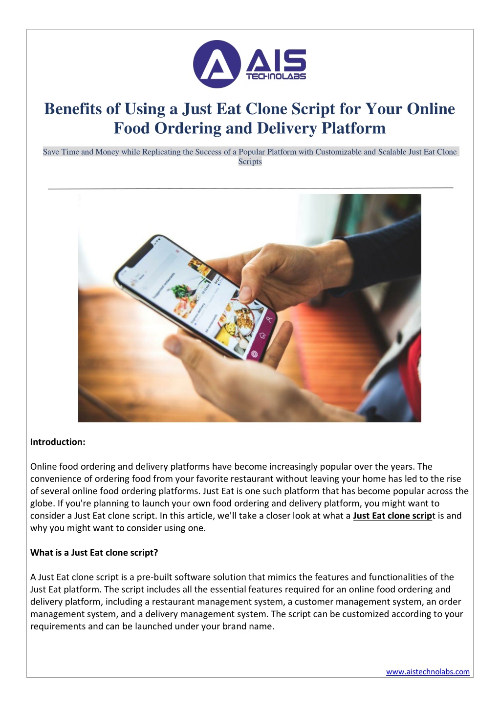 Benefits of Using a Just Eat Clone Script for Your Online Food Ordering and Delivery Platform Save Time and Money while Replicating the Success of a Popular Platform with Customizable and Scalable Just Eat Clone Scripts Introduction: Online food ordering and delivery platforms have become increasingly popular over the years. The convenience of ordering food from your favorite restaurant without leaving your home has led to the rise of several online food ordering platforms. Just Eat is one such platform that has become popular across the globe. If you're planning to launch your own food ordering and delivery platform, you might want to consider a Just Eat clone script. In this article, we'll take a closer look at what a Just Eat clone script is and why you might want to consider using one. What is a Just Eat clone script? A Just Eat clone script is a pre-built software solution that mimics the features and functionalities of the Just Eat platform. The script includes all the essential features required for an online food ordering and delivery platform, including a restaurant management system, a customer management system, an order management system, and a delivery management system. The script can be customized according to your requirements and can be launched under your brand name. www.aistechnolabs.com