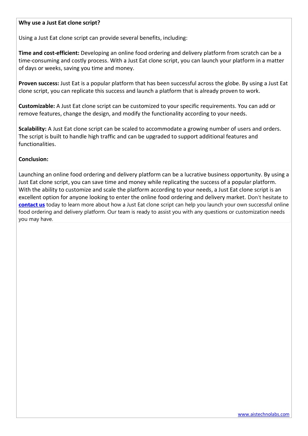 Why use a Just Eat clone script? Using a Just Eat clone script can provide several benefits, including: Time and cost-efficient: Developing an online food ordering and delivery platform from scratch can be a time-consuming and costly process. With a Just Eat clone script, you can launch your platform in a matter of days or weeks, saving you time and money. Proven success: Just Eat is a popular platform that has been successful across the globe. By using a Just Eat clone script, you can replicate this success and launch a platform that is already proven to work. Customizable: A Just Eat clone script can be customized to your specific requirements. You can add or remove features, change the design, and modify the functionality according to your needs. Scalability: A Just Eat clone script can be scaled to accommodate a growing number of users and orders. The script is built to handle high traffic and can be upgraded to support additional features and functionalities. Conclusion: Launching an online food ordering and delivery platform can be a lucrative business opportunity. By using a Just Eat clone script, you can save time and money while replicating the success of a popular platform. With the ability to customize and scale the platform according to your needs, a Just Eat clone script is an excellent option for anyone looking to enter the online food ordering and delivery market. Don't hesitate to contact us today to learn more about how a Just Eat clone script can help you launch your own successful online food ordering and delivery platform. Our team is ready to assist you with any questions or customization needs you may have. www.aistechnolabs.com
