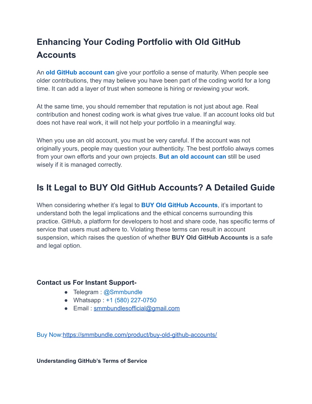 8. Enhancing Your Coding Portfolio with Old GitHub Accounts An old GitHub account can give your portfolio a sense of maturity. When people see older contributions, they may believe you have been part of the coding world for a long time. It can add a layer of trust when someone is hiring or reviewing your work. At the same time, you should remember that reputation is not just about age. Real contribution and honest coding work is what gives true value. If an account looks old but does not have real work, it will not help your portfolio in a meaningful way. When you use an old account, you must be very careful. If the account was not originally yours, people may question your authenticity. The best portfolio always comes from your own efforts and your own projects. But an old account can still be used wisely if it is managed correctly. Is It Legal to BUY Old GitHub Accounts? A Detailed Guide When considering whether it’s legal to BUY Old GitHub Accounts, it’s important to understand both the legal implications and the ethical concerns surrounding this practice. GitHub, a platform for developers to host and share code, has specific terms of service that users must adhere to. Violating these terms can result in account suspension, which raises the question of whether BUY Old GitHub Accounts is a safe and legal option. Contact us For Instant Support- ● Telegram : @Smmbundle ● Whatsapp : +1 (580) 227-0750 ● Email : smmbundlesofficial@gmail.com Buy Now:https://smmbundle.com/product/buy-old-github-accounts/ Understanding GitHub’s Terms of Service