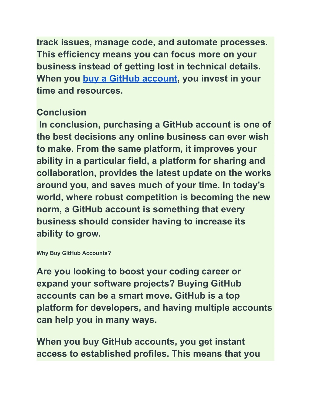 track issues, manage code, and automate processes. This efficiency means you can focus more on your business instead of getting lost in technical details. When you buy a GitHub account, you invest in your time and resources. Conclusion In conclusion, purchasing a GitHub account is one of the best decisions any online business can ever wish to make. From the same platform, it improves your ability in a particular field, a platform for sharing and collaboration, provides the latest update on the works around you, and saves much of your time. In today’s world, where robust competition is becoming the new norm, a GitHub account is something that every business should consider having to increase its ability to grow. Why Buy GitHub Accounts? Are you looking to boost your coding career or expand your software projects? Buying GitHub accounts can be a smart move. GitHub is a top platform for developers, and having multiple accounts can help you in many ways. When you buy GitHub accounts, you get instant access to established profiles. This means that you