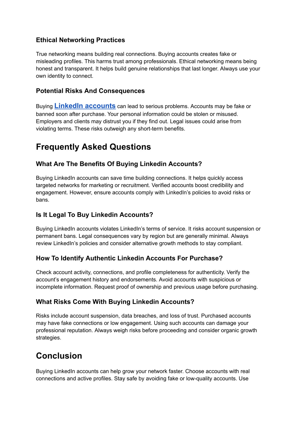 Ethical Networking Practices True networking means building real connections. Buying accounts creates fake or misleading profiles. This harms trust among professionals. Ethical networking means being honest and transparent. It helps build genuine relationships that last longer. Always use your own identity to connect. Potential Risks And Consequences Buying LinkedIn accounts can lead to serious problems. Accounts may be fake or banned soon after purchase. Your personal information could be stolen or misused. Employers and clients may distrust you if they find out. Legal issues could arise from violating terms. These risks outweigh any short-term benefits. Frequently Asked Questions What Are The Benefits Of Buying Linkedin Accounts? Buying LinkedIn accounts can save time building connections. It helps quickly access targeted networks for marketing or recruitment. Verified accounts boost credibility and engagement. However, ensure accounts comply with LinkedIn’s policies to avoid risks or bans. Is It Legal To Buy Linkedin Accounts? Buying LinkedIn accounts violates LinkedIn’s terms of service. It risks account suspension or permanent bans. Legal consequences vary by region but are generally minimal. Always review LinkedIn’s policies and consider alternative growth methods to stay compliant. How To Identify Authentic Linkedin Accounts For Purchase? Check account activity, connections, and profile completeness for authenticity. Verify the account’s engagement history and endorsements. Avoid accounts with suspicious or incomplete information. Request proof of ownership and previous usage before purchasing. What Risks Come With Buying Linkedin Accounts? Risks include account suspension, data breaches, and loss of trust. Purchased accounts may have fake connections or low engagement. Using such accounts can damage your professional reputation. Always weigh risks before proceeding and consider organic growth strategies. Conclusion Buying LinkedIn accounts can help grow your network faster. Choose accounts with real connections and active profiles. Stay safe by avoiding fake or low-quality accounts. Use