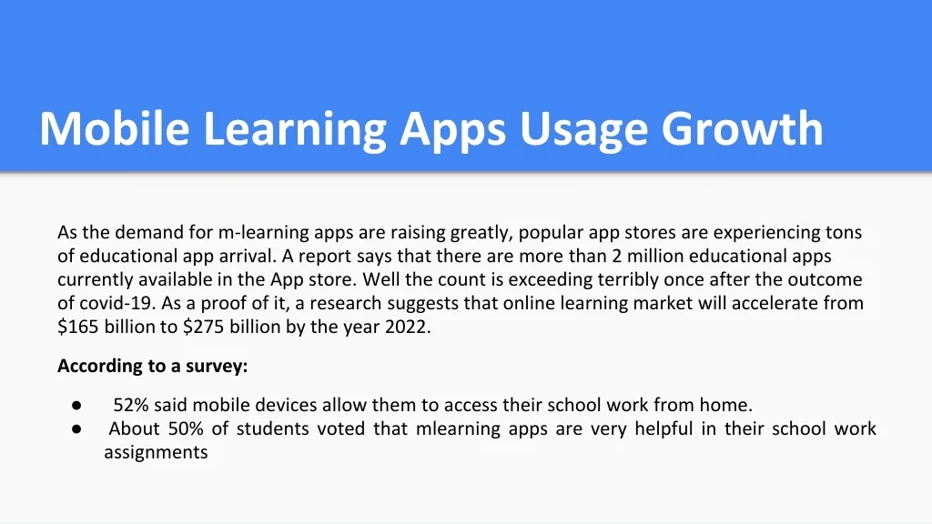 Mobile Learning Apps Usage Growth As the demand for m-learning apps are raising greatly, popular app stores are experiencing tons of educational app arrival. A report says that there are more than 2 million educational apps currently available in the App store. Well the count is exceeding terribly once after the outcome of covid-19. As a proof of it, a research suggests that online learning market will accelerate from $165 billion to $275 billion by the year 2022. According to a survey: • 52% said mobile devices allow them to access their school work from home. • About 50% of students voted that mlearning apps are very helpful in their school work assignments